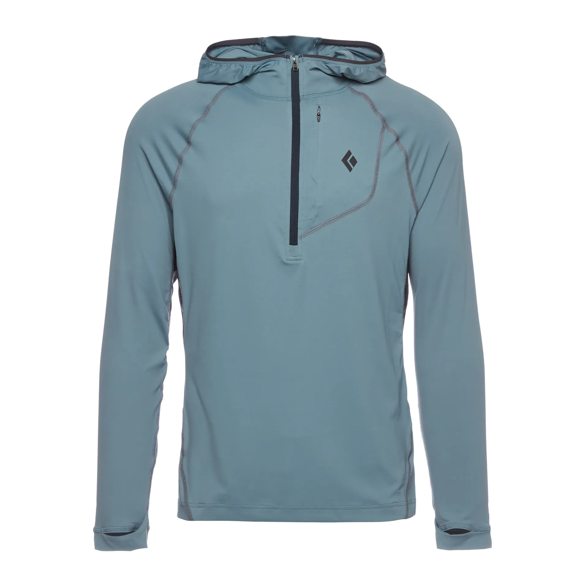 A quarter-zip opening at the neck allows for extra ventilation when working hard, while the elasticated over-the-helmet hood provides further coverage for multi-pitch ascents and long belay jobs in exposed surroundings.