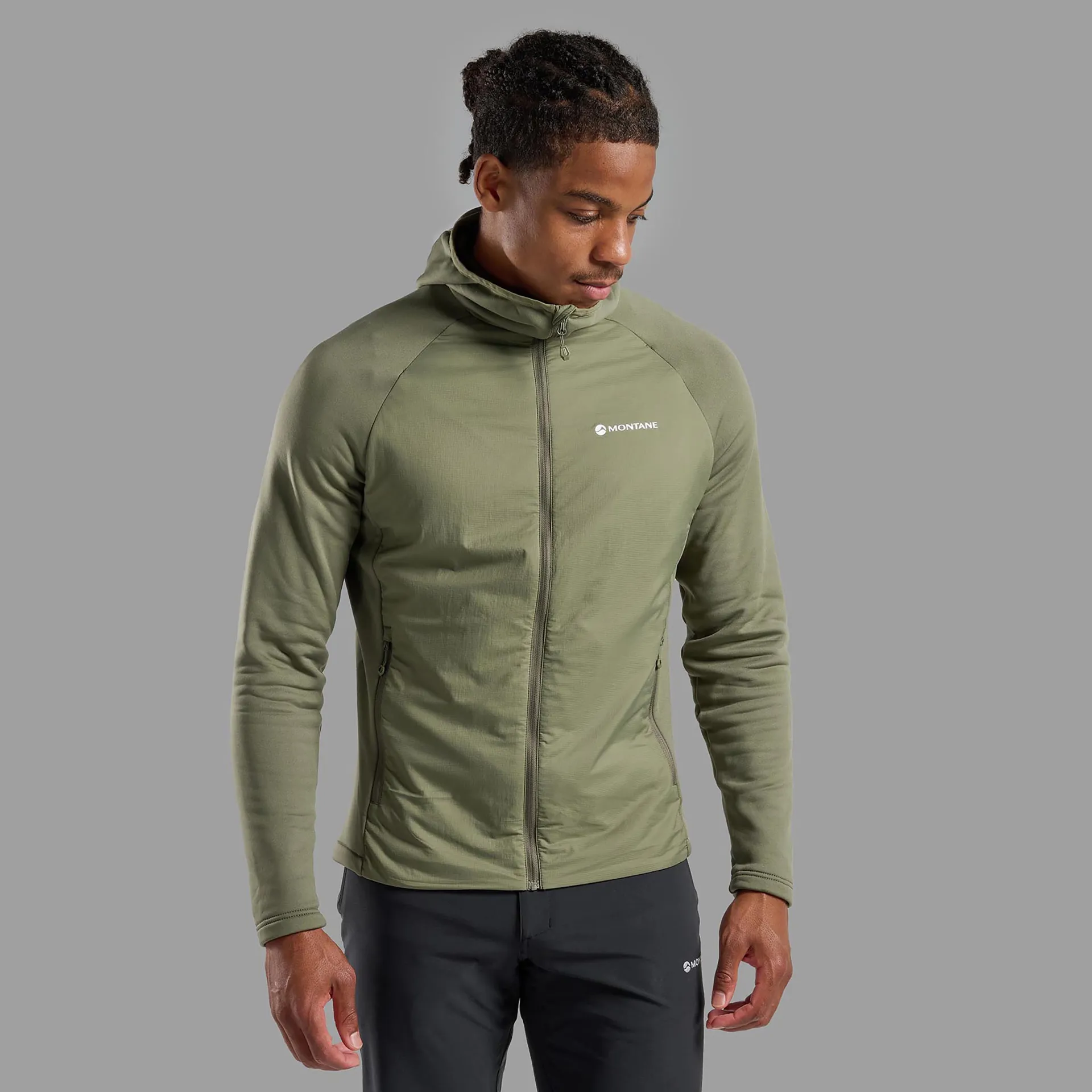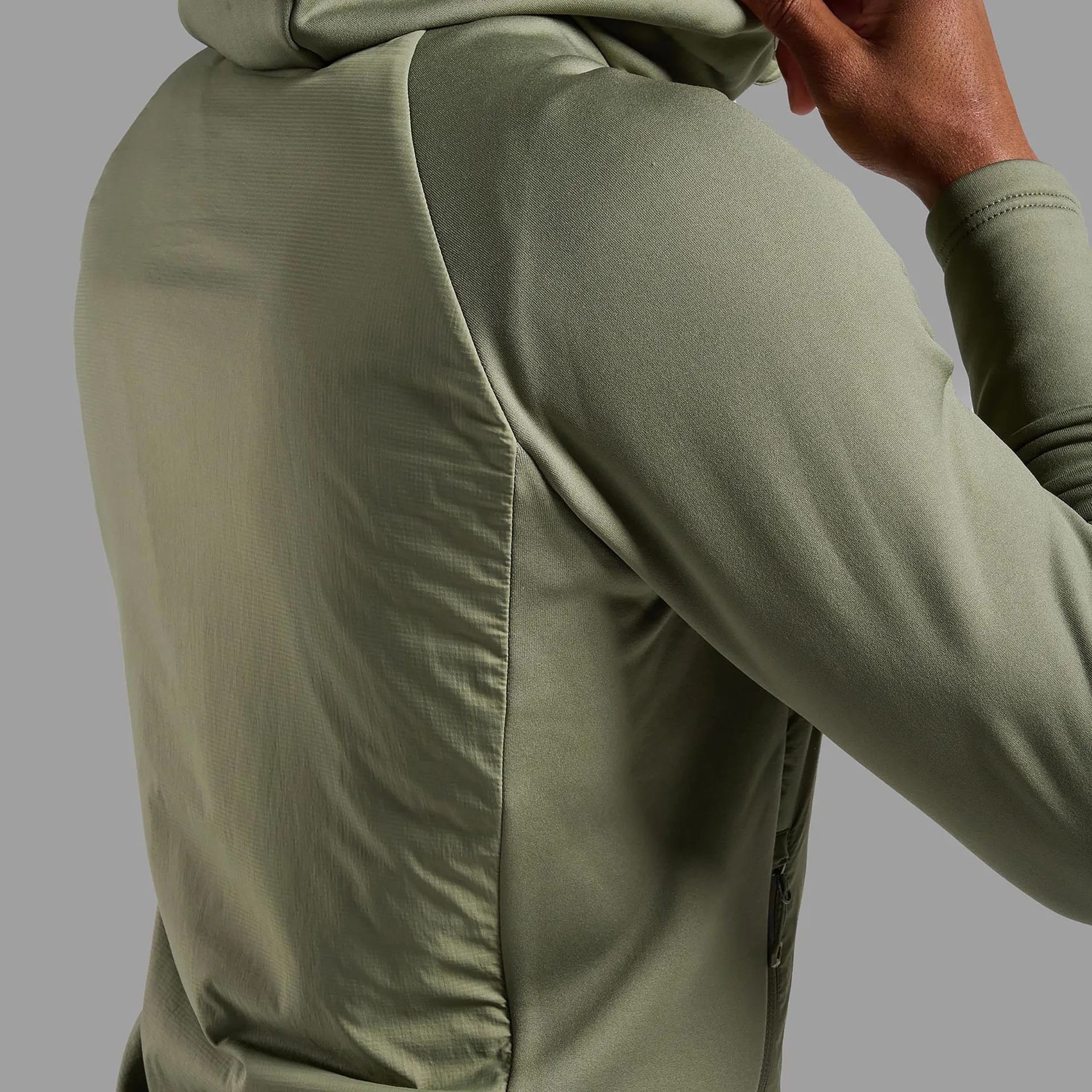 Montane has used Featherlite Air stretch Ripstop across the majority of the hoodie, which is made from 20D recycled nylon yarns. This soft, lightweight material offers high levels of wind resistance and exceptional breathability to deliver outstanding comfort and uncompromised performance. The material is finished with a PFC-free DWR (durable water repellent) coating to encourage light rain to bead off the fabric instead of soaking in, without using harmful forever chemicals that damage the environment and our ecosystems. However, please note this does not make the hoodie waterproof.
