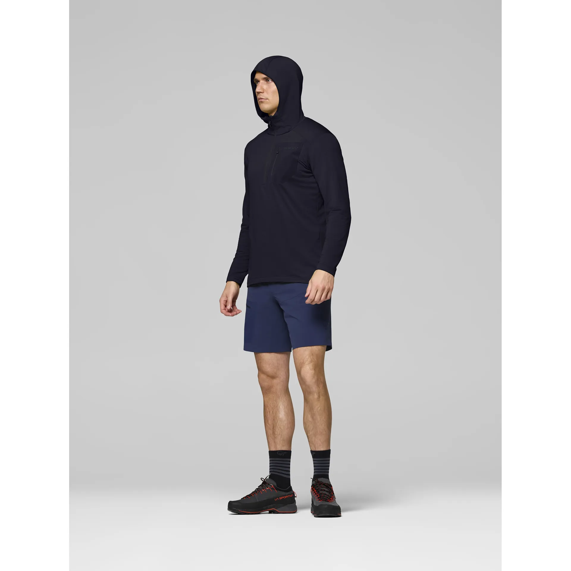 Complementing this is the secondary fabric, a 92% recycled polyester and 8% elastane grid fleece weighing 130g/m². This fabric features a unique one-sided grid texture that enhances air circulation, allowing body heat to dissipate during high-output activities while still providing consistent warmth. The added elastane introduces stretch and flexibility, ensuring unrestricted movement whether climbing, skiing, or running. Its smooth exterior and soft interior make it exceptionally comfortable next to the skin, allowing the hoodie to be worn directly without irritation. Together, these fabrics create a technical balance of warmth, breathability, and mobility — essential qualities for active mountain use.