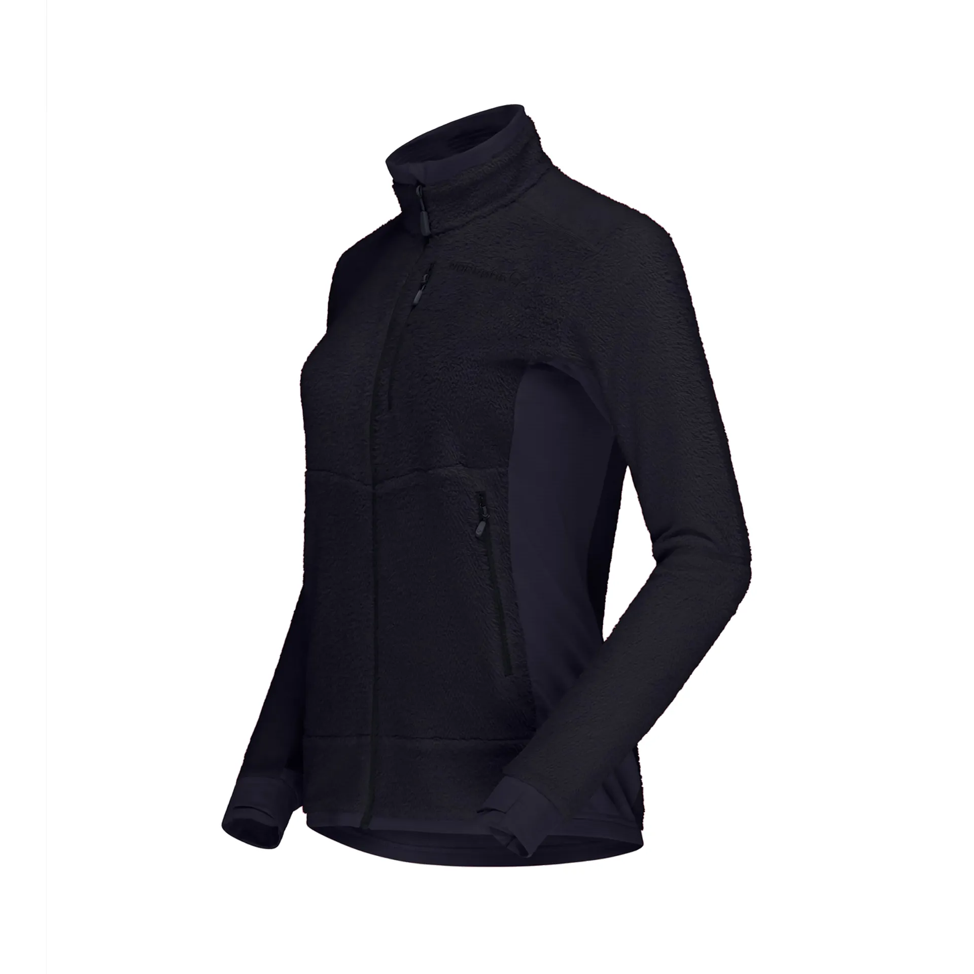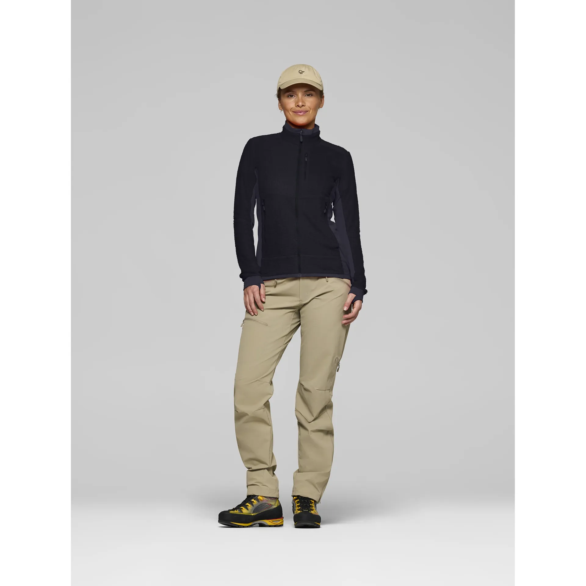 The main fabric features Norrona's lightweight warm1 fleece, made entirely from 100% recycled polyester (PES). This soft, lofty material provides impressive insulation for its low weight, trapping warm air close to the body while efficiently wicking away moisture.