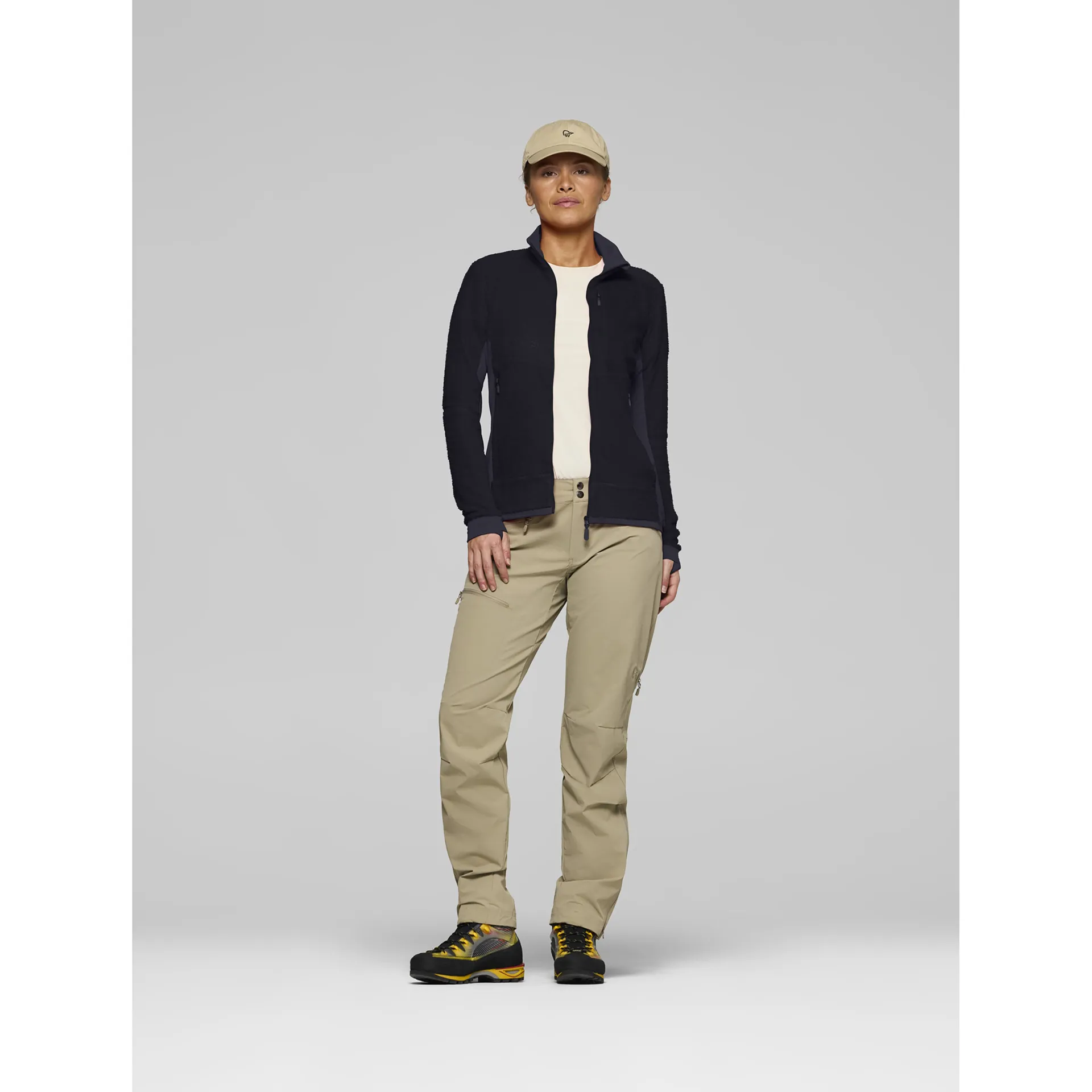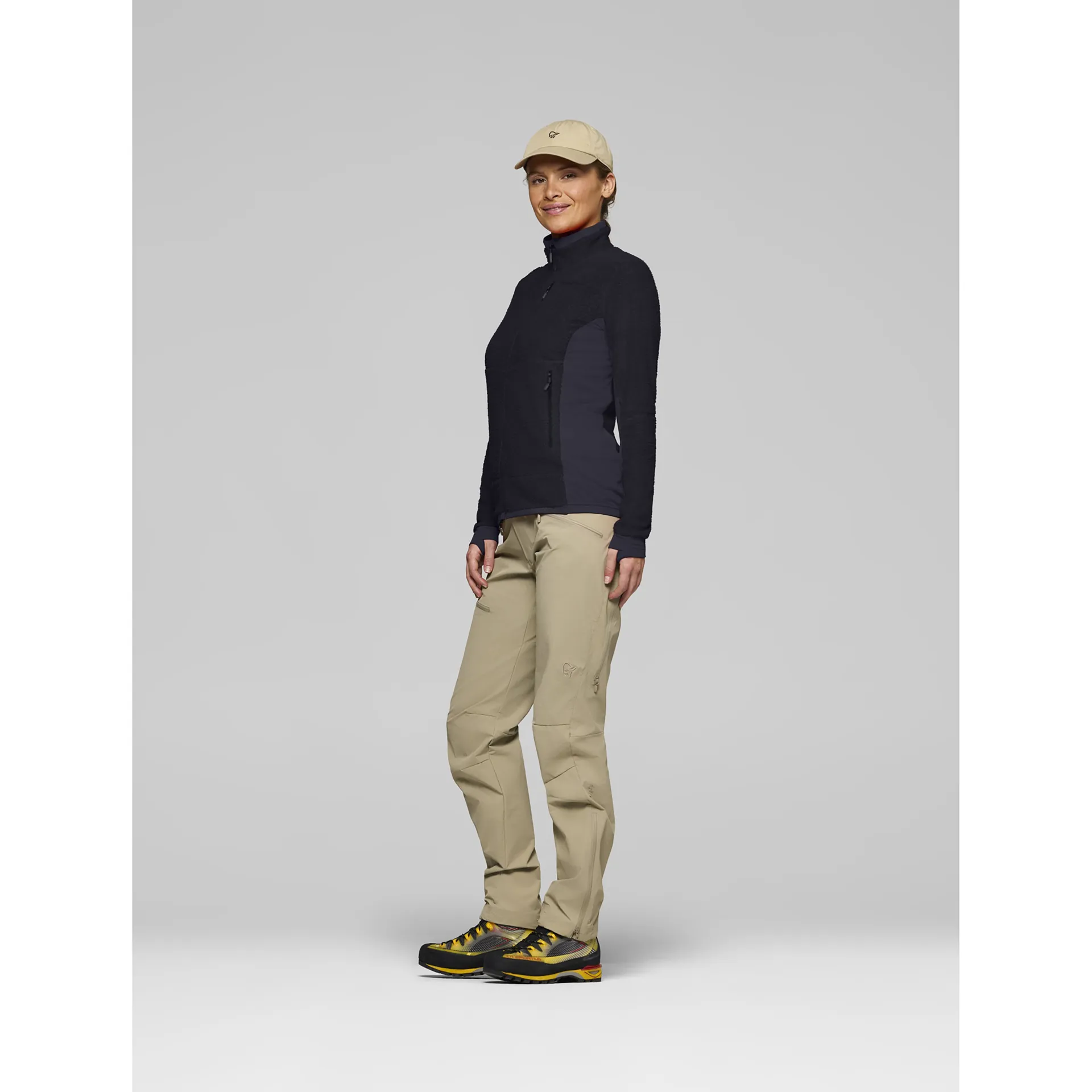 The warm1 series represents Norrona's lightest and most breathable fleece category, weighing under 200g/m². These fabrics trap warm air effectively while maintaining high moisture transport for all-day comfort.