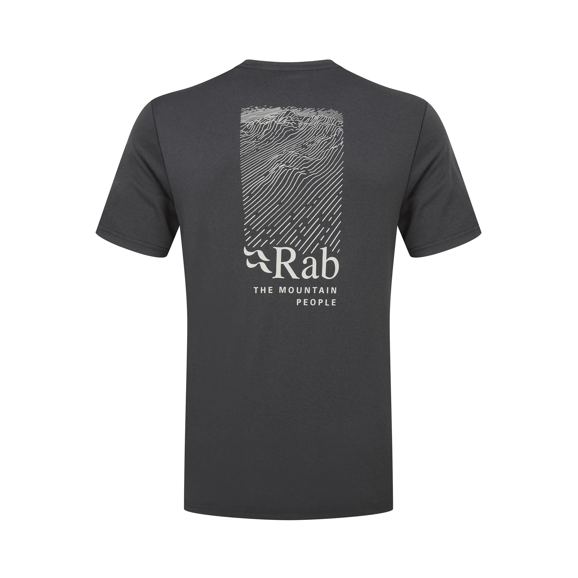 The t-shirt is decorated with a small Rab logo on the front and a larger topographic print on the back for a touch of style, making this tee suitable for both casual and outdoor use.