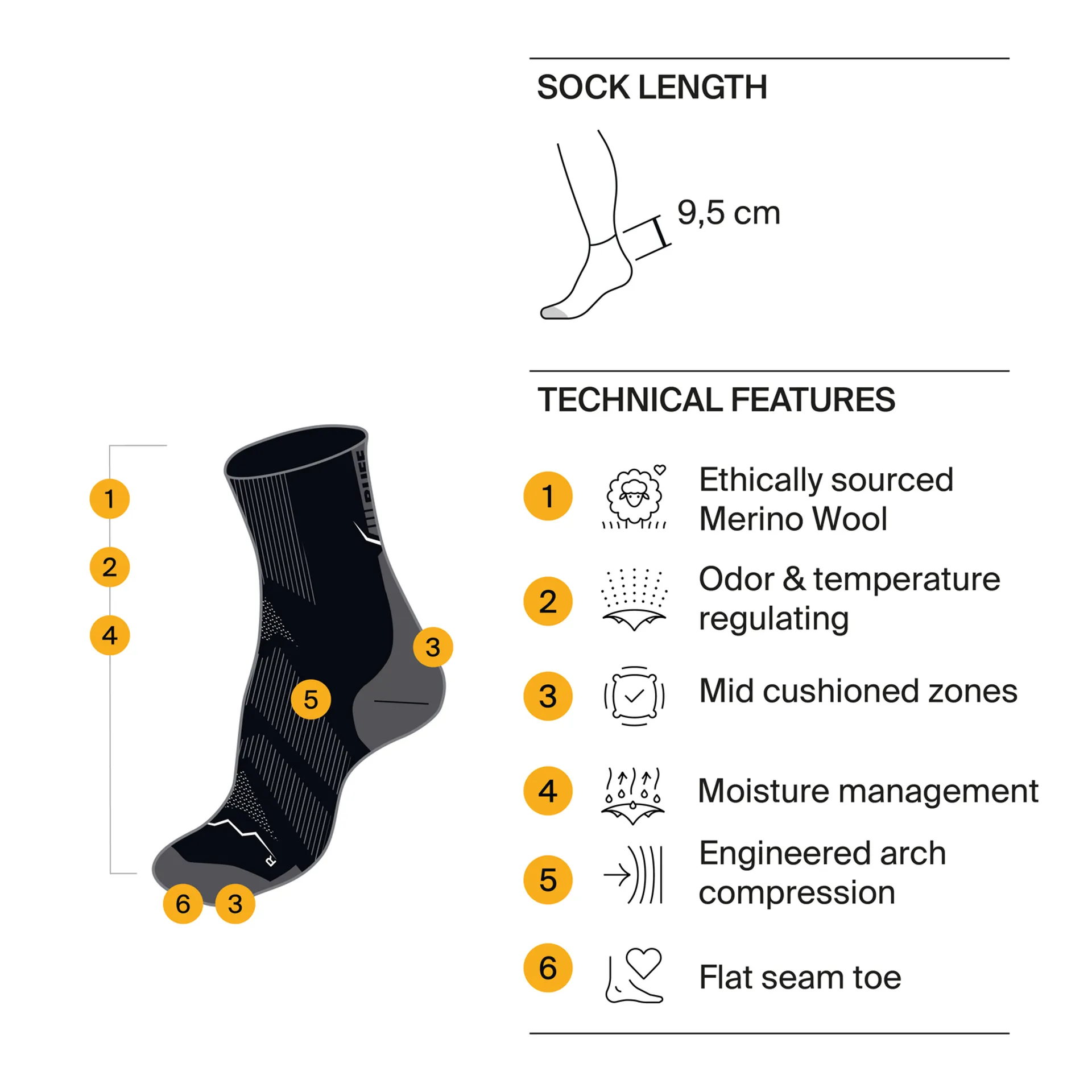 With mapped light cushioning zones for endurance, these socks deliver targeted comfort where it counts. Merino wool provides natural odour control and climate regulation, while flat seams prevent friction and hotspots. Engineered arch compression offers support and stability for all-day movement. Sustainably made in Italy using ethically sourced fibres, they’re as kind to your feet as they are to the planet.