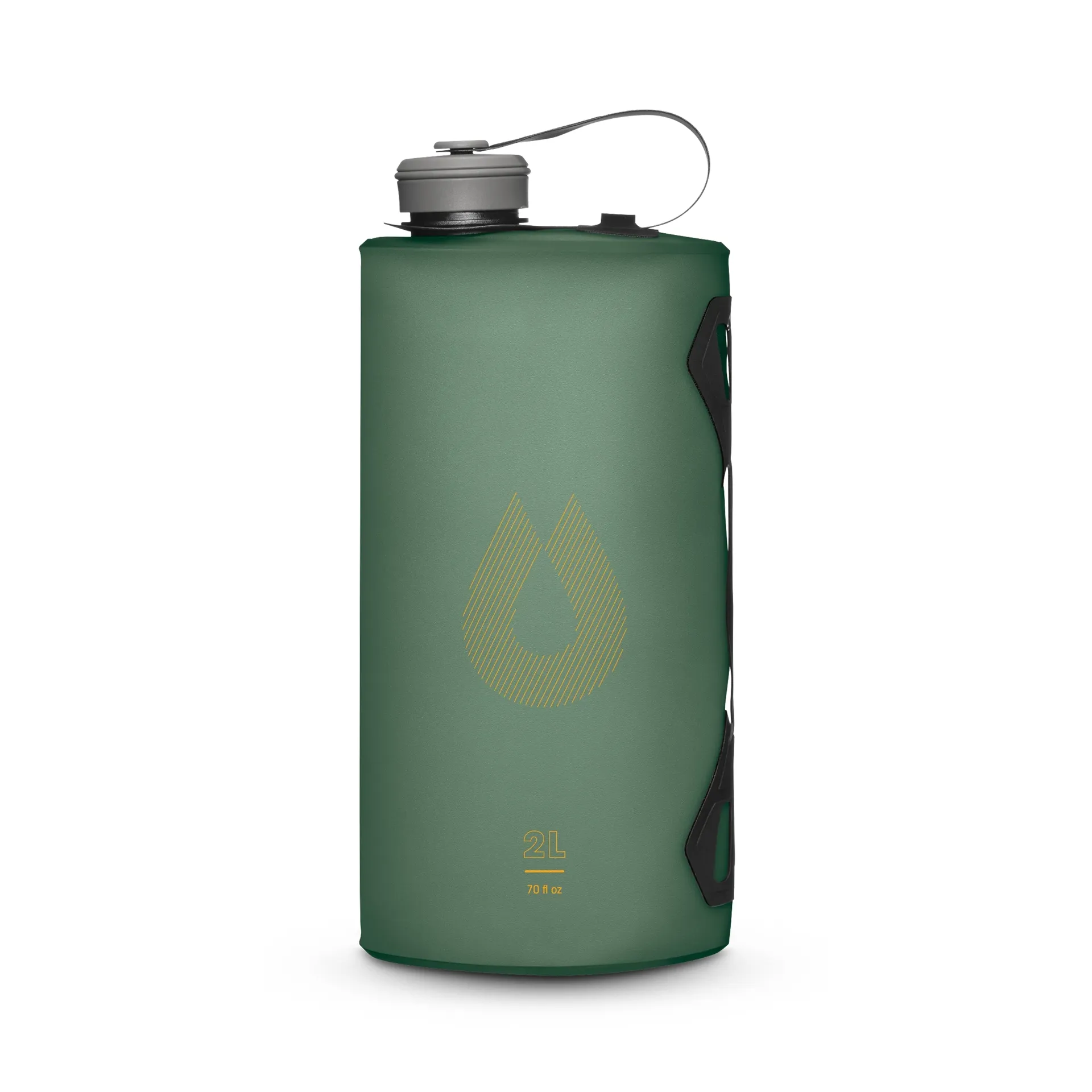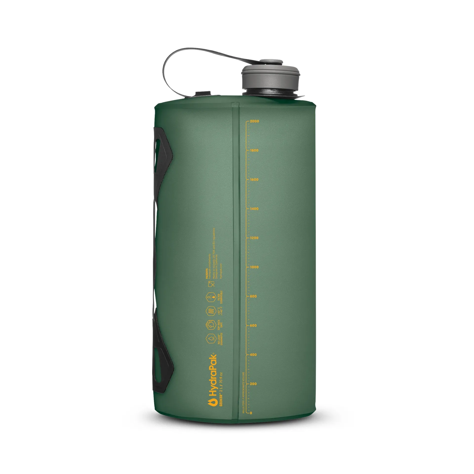 The PP (polypropylene) screw cap delivers a tight, dependable seal that prevents leaks in packs or during transport. It's tethered, so you never risk dropping or losing it while filling from streams or basins. The TPU-coated nylon handle adds durability and grip where it matters most — when you're carrying a full 2L load or pouring into a cooking pot or water bottle. It provides structure without bulk, making the Seeker easy to control even with cold hands or gloves.