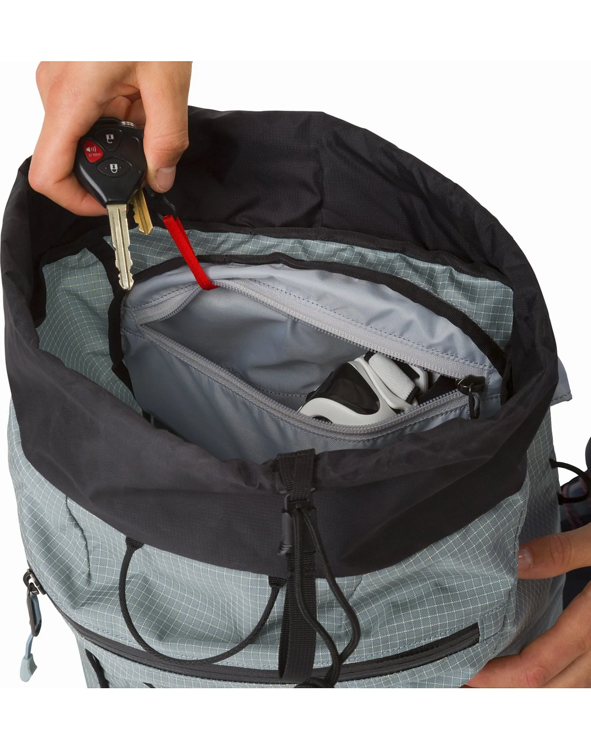 One of the most impressive features of the Alpha AR is the face fabric - the pack is constructed using N315r-LCP which is a high tenacity nylon with a Liquid Crystal Polymer ripstop grid that Arcteryx helped design. You may be familiar with Arcteryx's AC² fabric which is used in the Bora and Alpha FL packs - well this fabric is a new breed and is a staggering 6-7x more abrasion resistant than AC². Basically what this gives you is a face fabric that will not only shrug of most of the weather but is also tough enough to handle long scrambles and being hauled up huge rock faces.