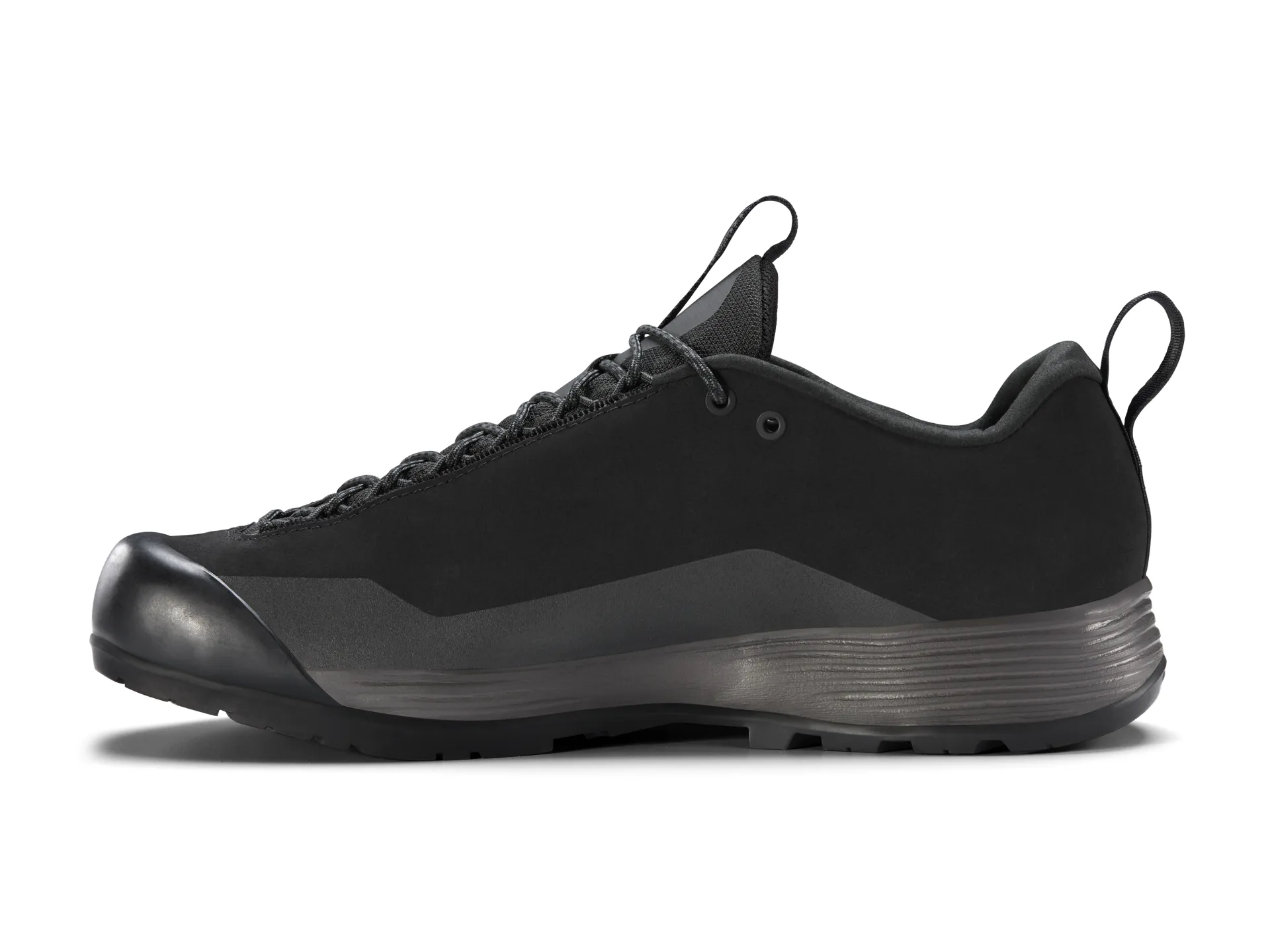 Upper: The upper of the shoe is made from high-quality leather, offering plenty of abrasion resistance and breathability. Arc'teryx fastens every piece of fabric down with micro-sized pieces of taping which glue the fabrics together internally, eliminating the possibility that a rock, bramble or sharp object of some sort will pull a stitch loose. A protective moulded rubber toe cap finishes this super durable shoe off and takes the majority of climbing abuse.