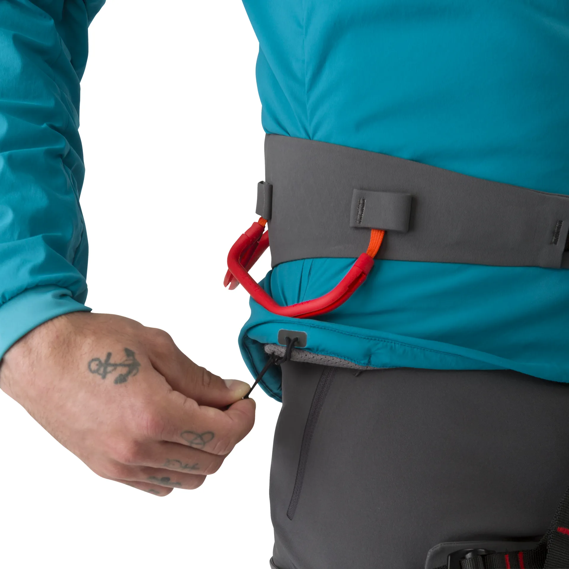 The Proton has a low profile, insulated, adjustable, helmet compatible hood that actually works well under a helmet too. It's generous enough to sit comfortably over a helmet but also cinches right down to sit snug to your head when you don't have a helmet on. The Proton also has two zippered chest pockets and two zippered hand pockets - all of which sit out of the way of the harness line so bits in your pockets don't dig in whilst you're climbing. At the bottom of the jacket you'll find dual hem adjusters to help keep the wind out and HemLocks - these stop the jacket from riding up out of your harness when you're climbing.