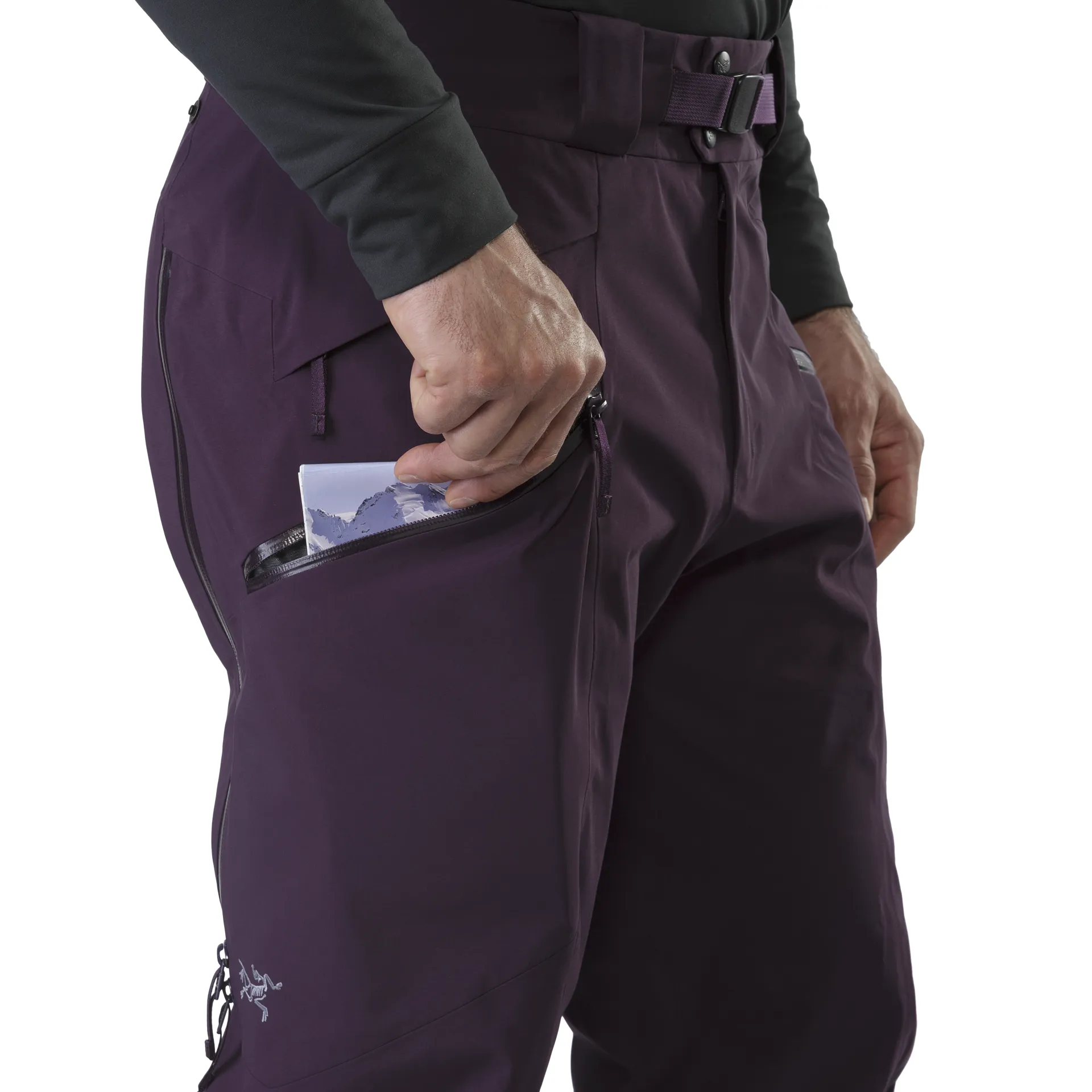 The trousers feature double-ended WaterTight side zips for extra ventilation and low-volume WaterTight zipped thigh pockets with a small zippered flap-covered stash pocket. The low profile belt loops, snap fly and removable belt are great for the days you have to wear a harness or a backpack with a chunky hipbelt. The trousers also feature Slide 'n Loc attachments, which are fasteners that attach the trousers to compatible jackets (e.g. Arcteryx's Rush Jacket) for a secure and protective system in deep snow.