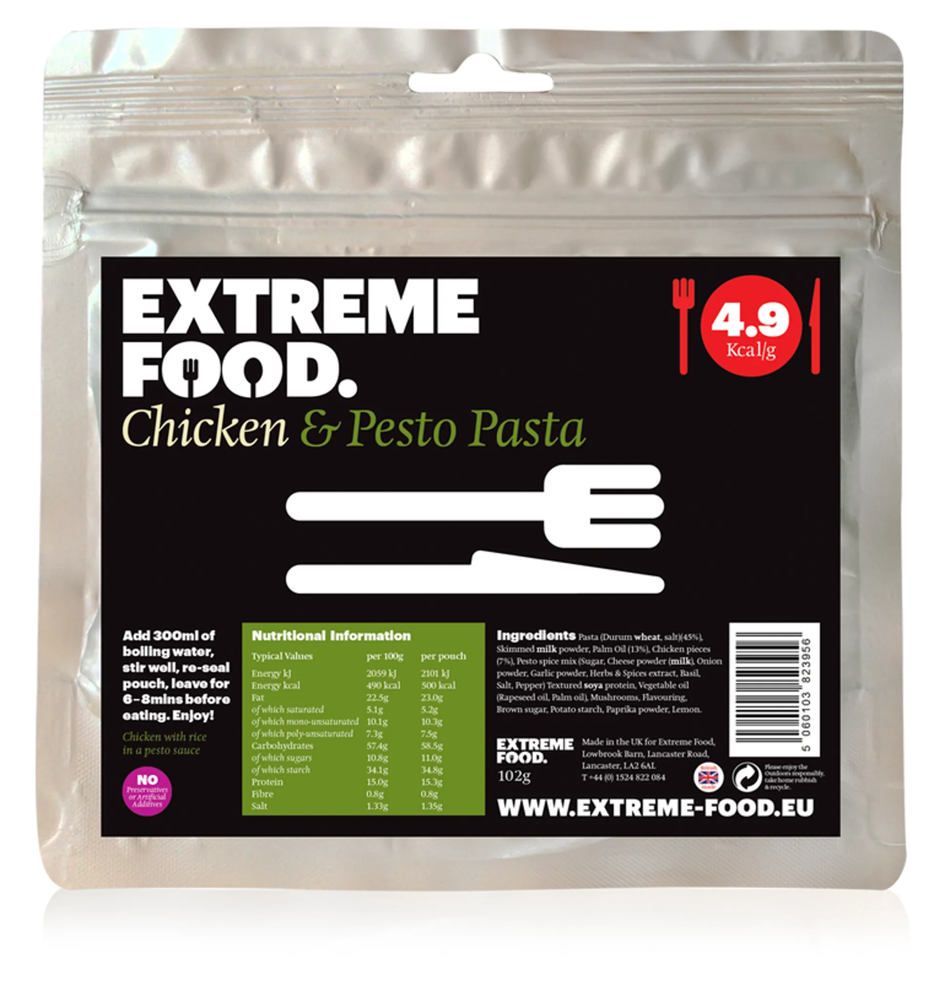 Extreme food is made in the UK using only the finest ingredients and gives you the highest calories for the lowest weight possible. All Extreme food has been developed by a team of nutritional experts with a mission to raise the bar for outdoor instant freeze-dried meals. All of the meals in the Extreme Food range taste good, use high quality and nutritionally balanced ingredients and use no artificial colourings or preservatives. The technique of instant freeze-drying retains all of the original flavours and elements and eliminates 90% of the original weight. Only 2% of liquid remains which inhibits the growth of enzymes and nasty bacteria so Extreme Food can be stored without refrigeration for many years.