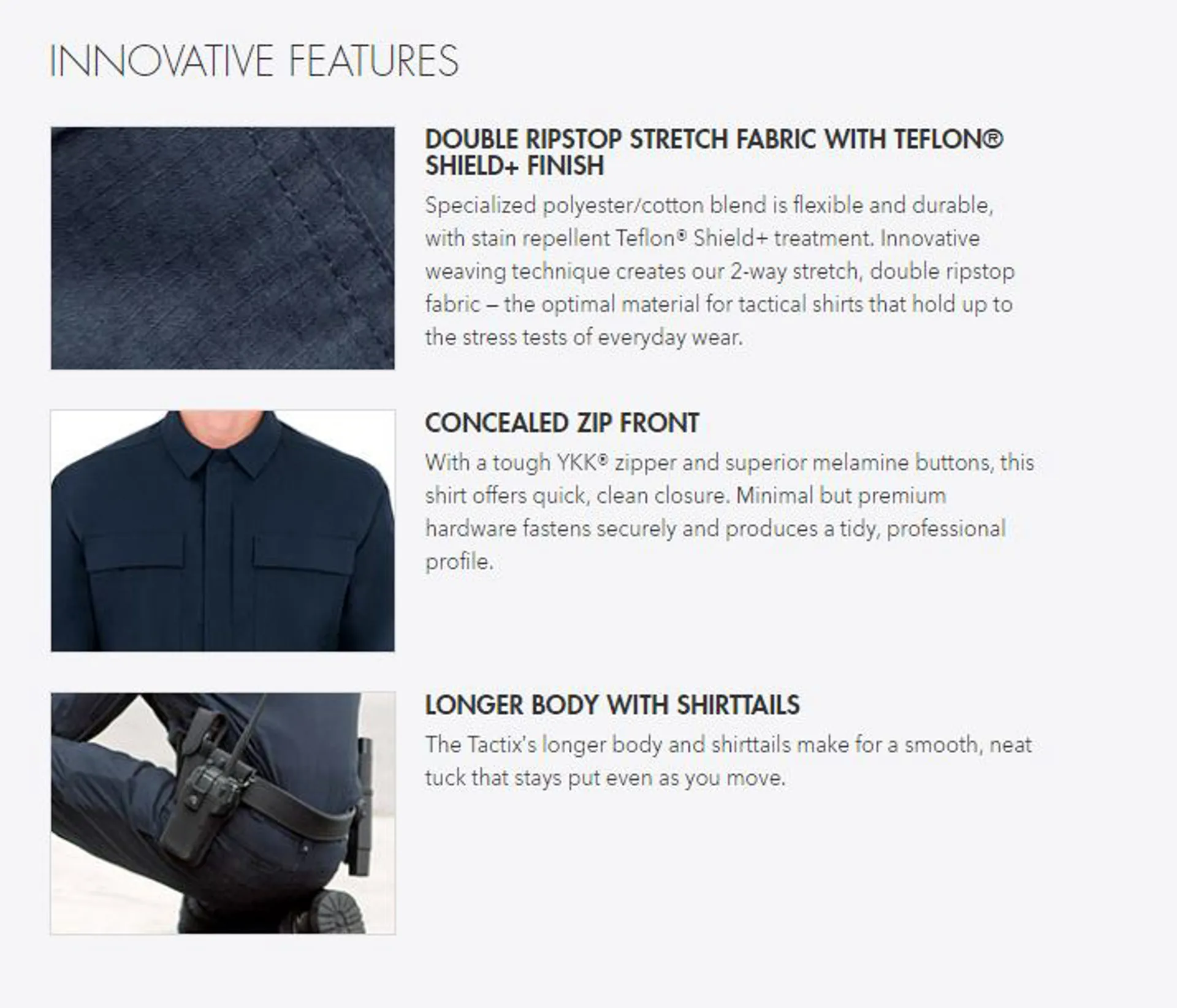 Specialised polyester/cotton blend is flexible and durable, with stain repellent Teflon Shield+ treatment. Innovative weaving technique creates our 2-way stretch, double ripstop fabric the optimal material for tactical shirts that hold up to the stress tests of everyday wear.