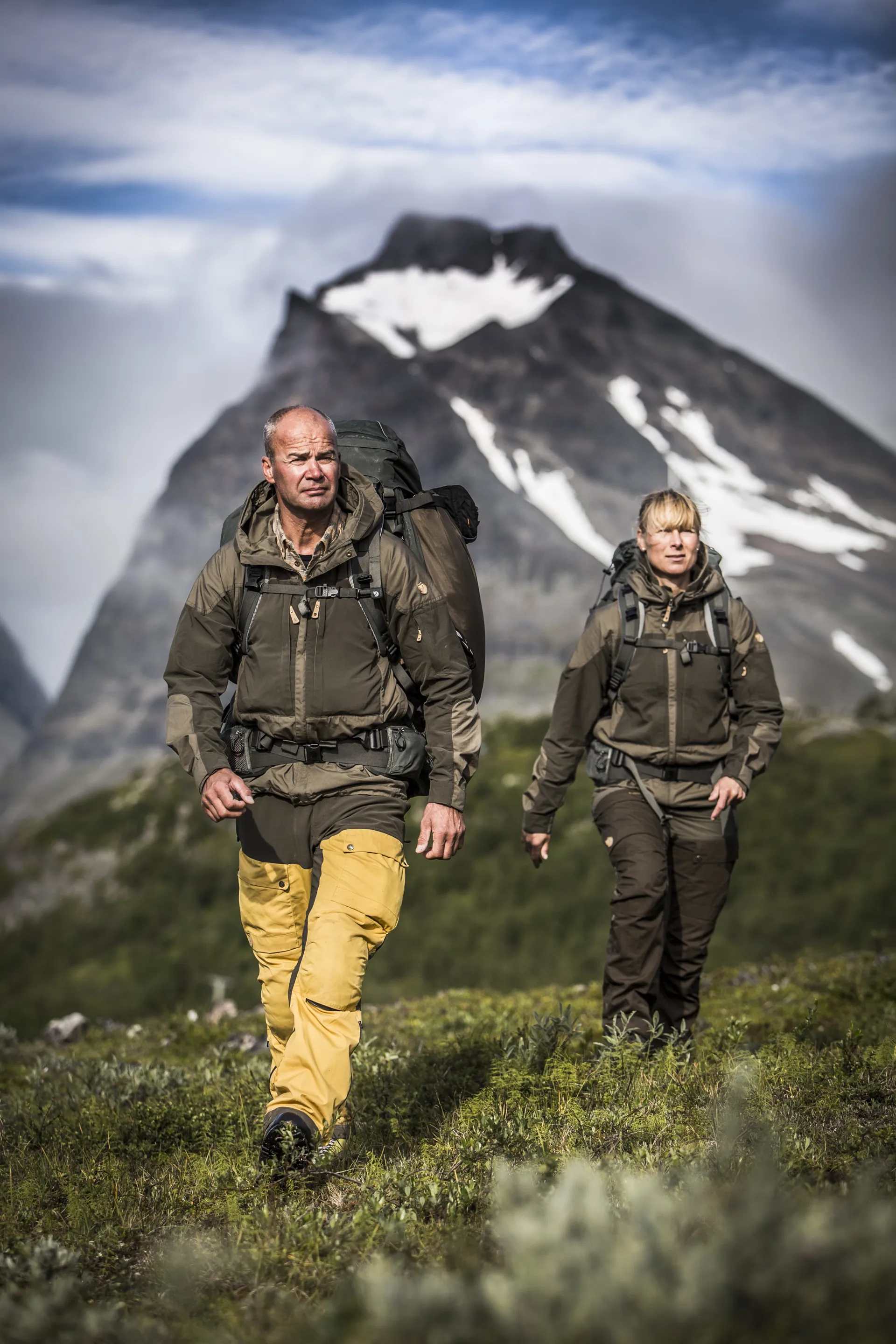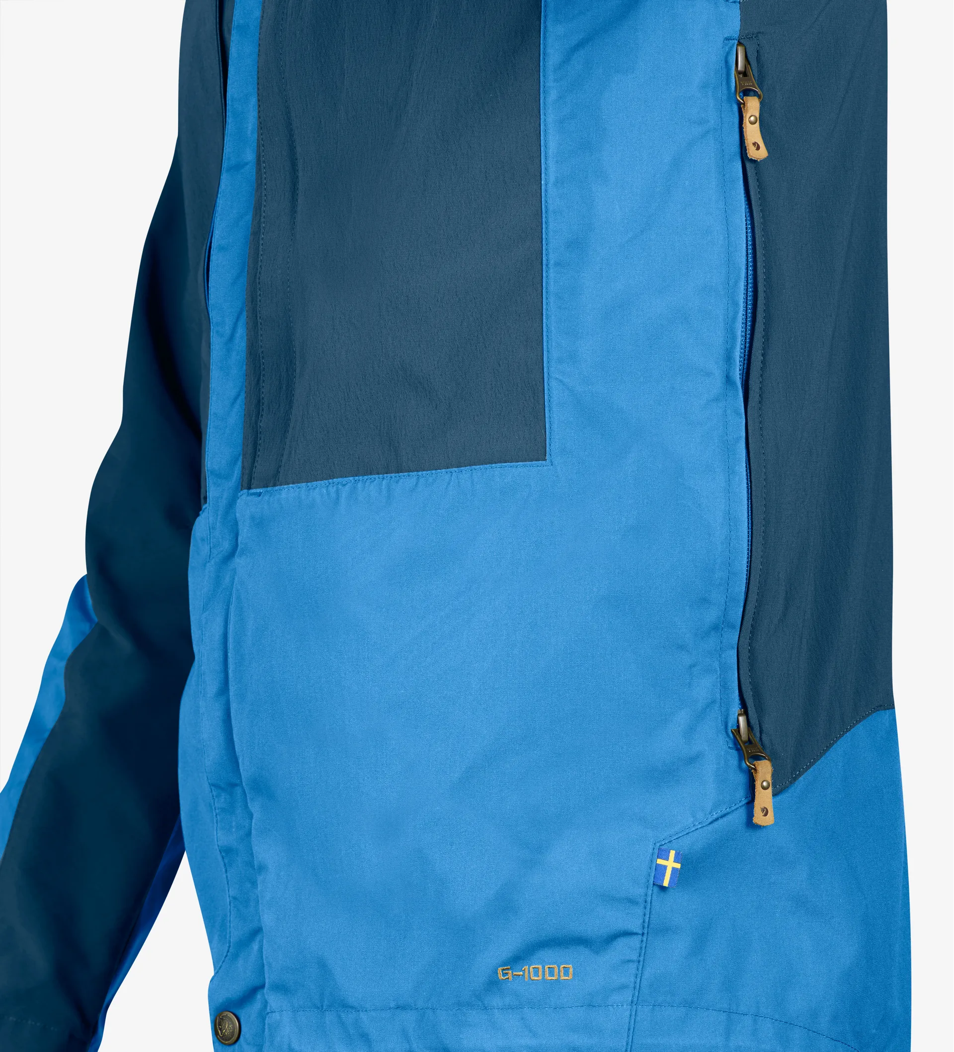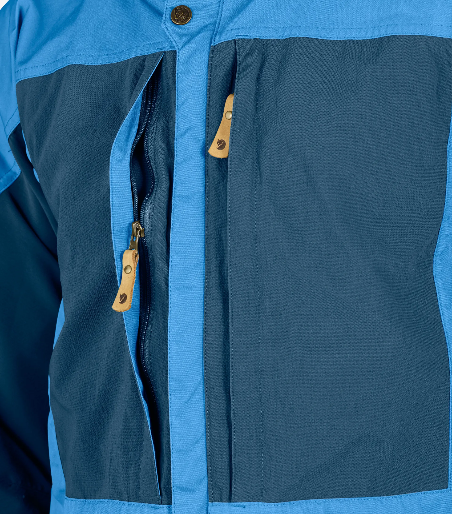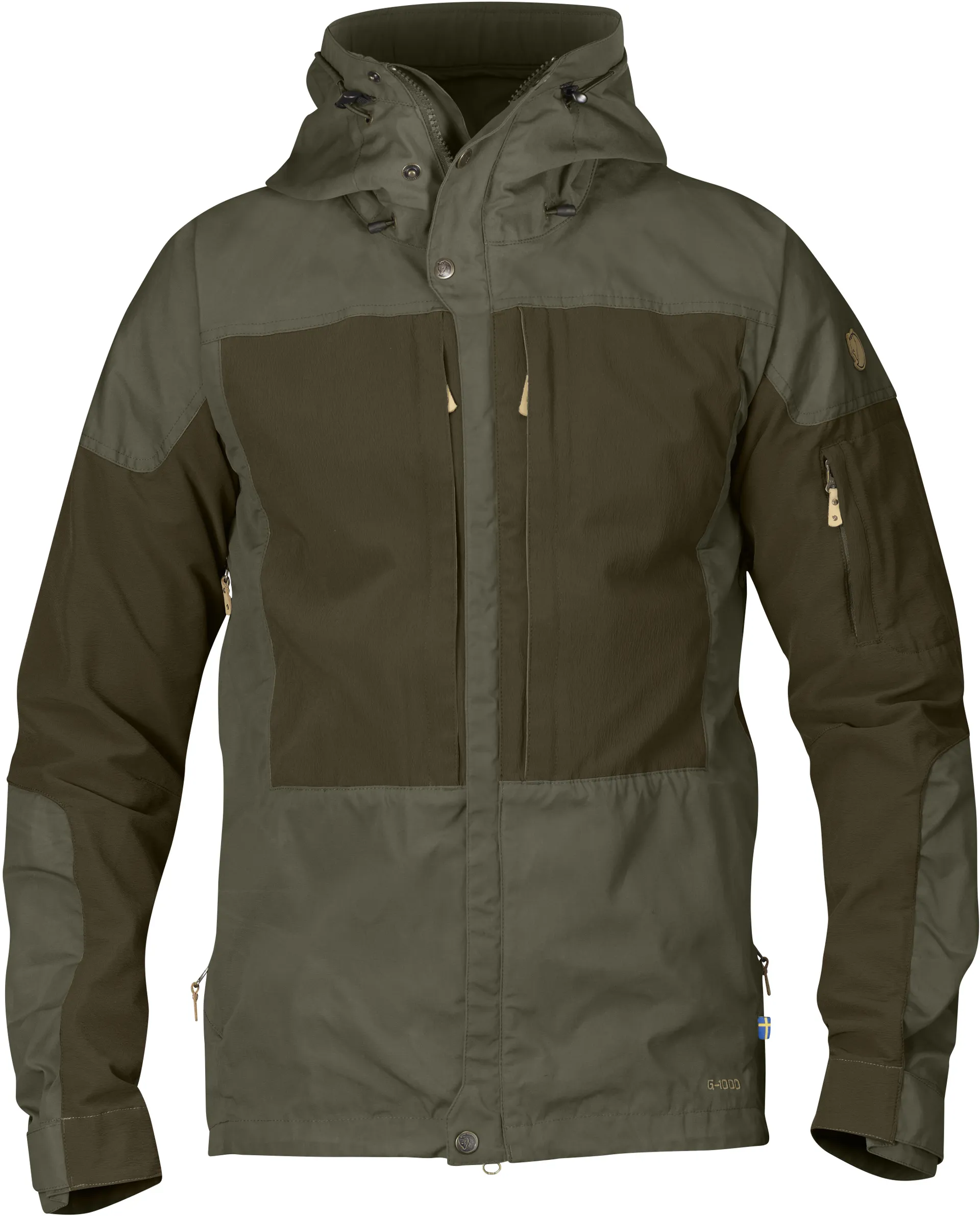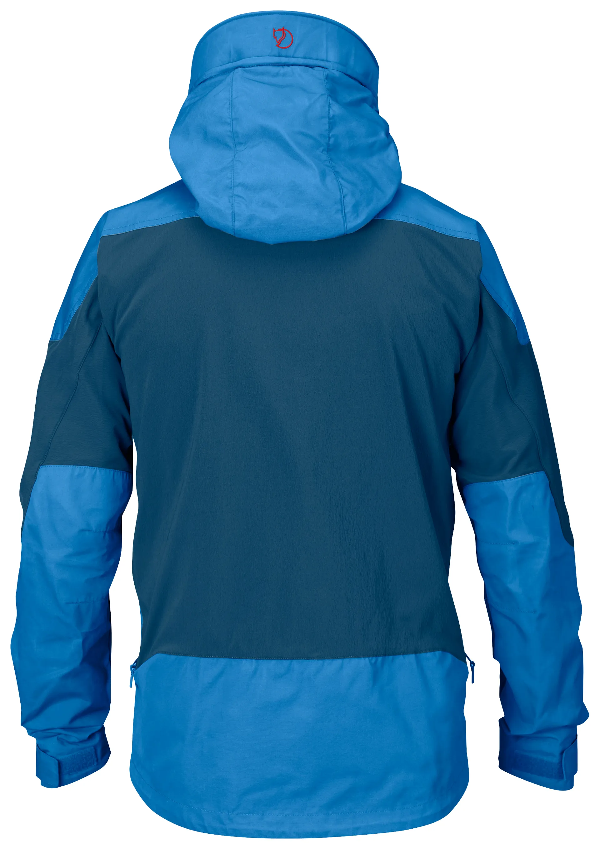 The Keb uses the brilliant G1000 fabric, a mixture of 65% polyester and 35% cotton on the main wear areas of chest, outer arms, hips and seat and a lightweight four way stretch softshell fabric across the back, shoulders and inner arms to provide complete freedom of movement. The whole lower part of the jacket has very few seams and a clean flat design so that it is comfortable under a rucksack hip belt or climbing harness. To increase the versatility of this brilliant jacket the G1000 fabric can be impregnated with Fjallraven Greenland Wax to improve water resistance. Twin vertical chest pockets provide essential storage and are covered with the four way stretch fabric to allow them to expand for bulkier items and are lined with G1000 to protect the chest from cold wind. Each pocket has a small stretchy inner pocket for phones, GPS, compass etc. Side zips allow increased ventilation and also access to inner layer pockets.