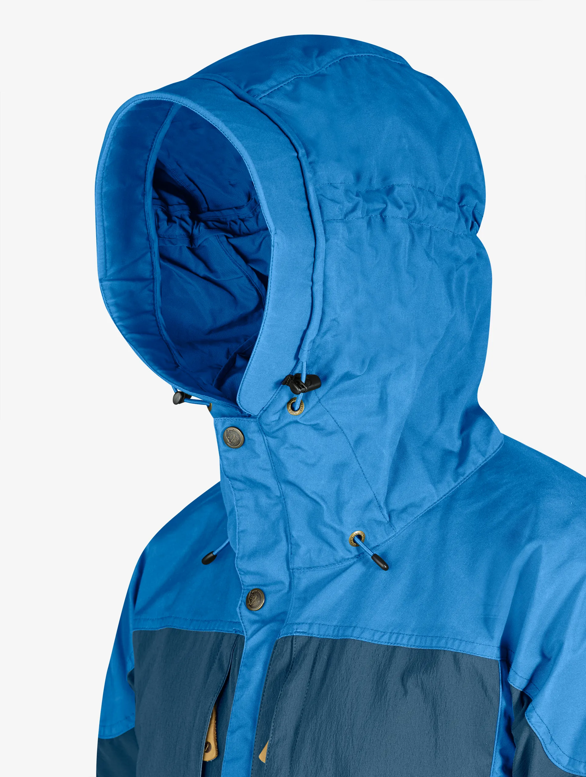 The full G1000 hood is a work of art. It is large enough to go over a climbing helmet yet will cinch down to be head compatible. When the hood is down and the zip fully up the large stiffened brim can be folded down to form a stable high collar to protect the neck and lower face. With the hood up you can keep the brim folded back for enhanced peripheral vision or fold it out to create a highly protective cone in extreme conditions.