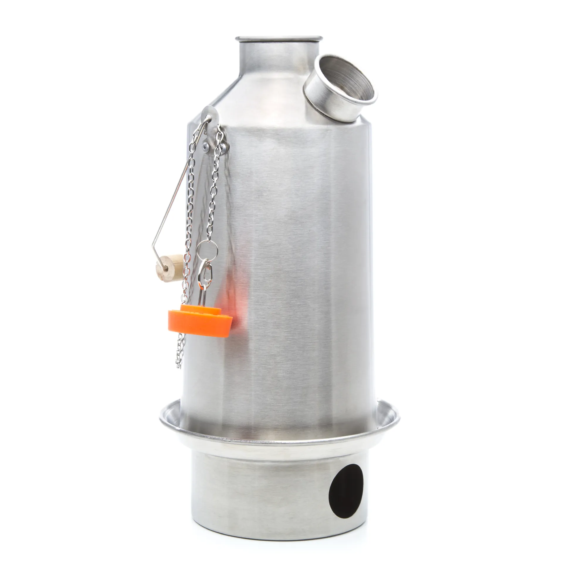 This all Stainless Steel Kelly Kettle is suited to base camp use due to it's size and weight.  The highly efficient kettle uses all natural fuel that you find in your environment so you don't have to carry gas or liquid fuel with you.  Simply fill the fire bowl with any natural combustible material, get the fire going and plonk the water filled kettle on top. The conical hollow inside the kettle draws the flames up the "chimney" and heats up the water very quickly.  If you add the optional pot support you can cook whilst your water boils.