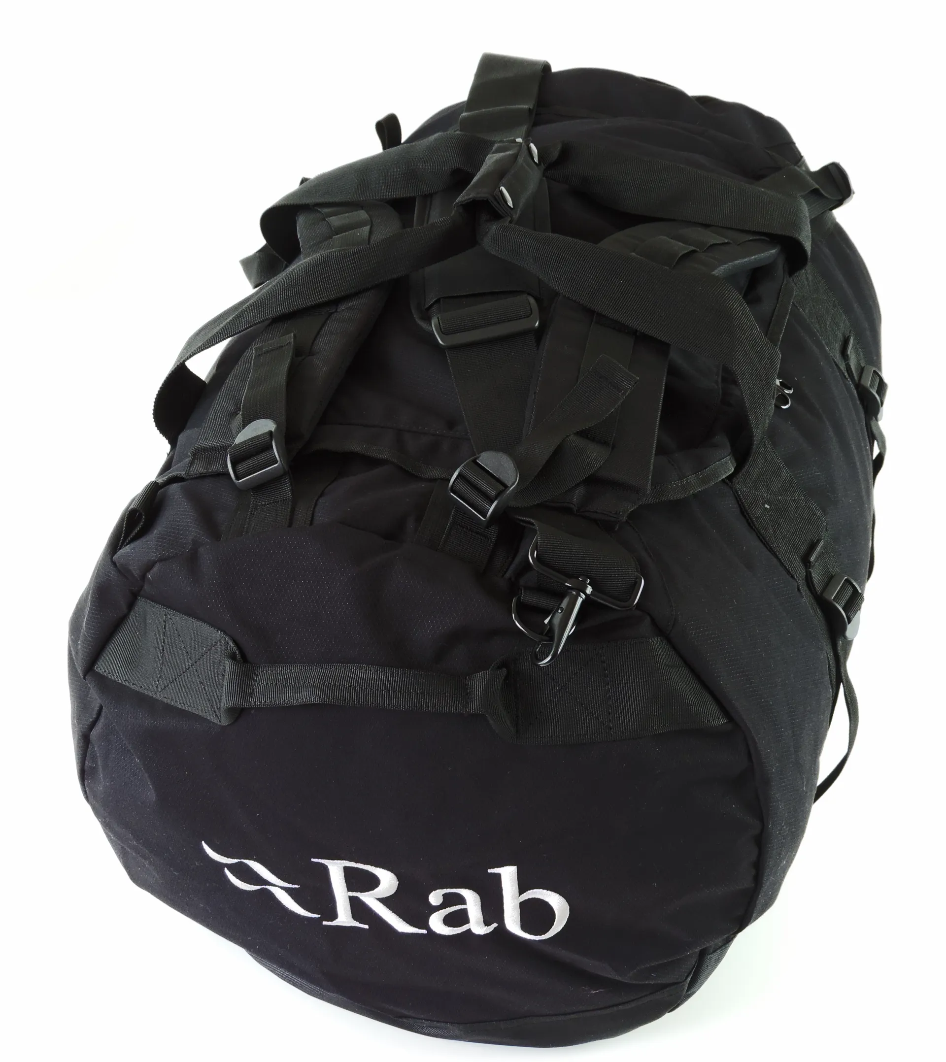 The Rab Expedition Kitbag 100 litre is a super burly lightweight duffel bag; it's simple with no faff. The 2 handles fasten together to form a carry handle, there is a removable adjustable shoulder strap, 2 padded adjustable back pack straps that can also be unthreaded and removed, and at either end there are strong webbing handles. Basically you can pick this bag up anyway you like.