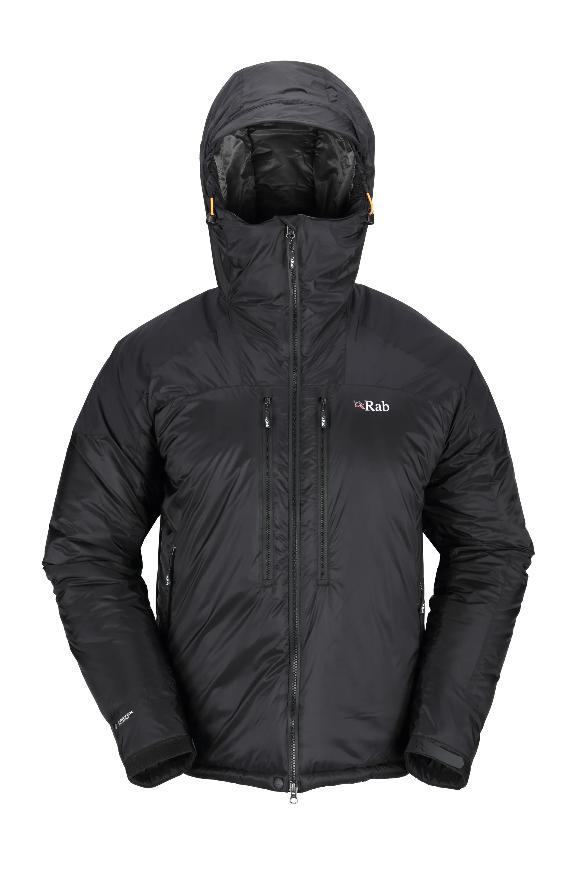 Rab have used their own Pyrotec 100% recycled synthetic fibre to provide insulation in the harshest environments. Pyrotec has a multi-denier construction that resists compression yet packs down easily. The fibres themselves are hydrophobic, so they absorb very little water and dry out exceptionally quickly. The Inferno Basecamp uses different weights of fabric to maximise warmth, breathability and practicality; the main body uses 200g/m², the arms and hood use 160g/m² and the wrists use 60g/m².