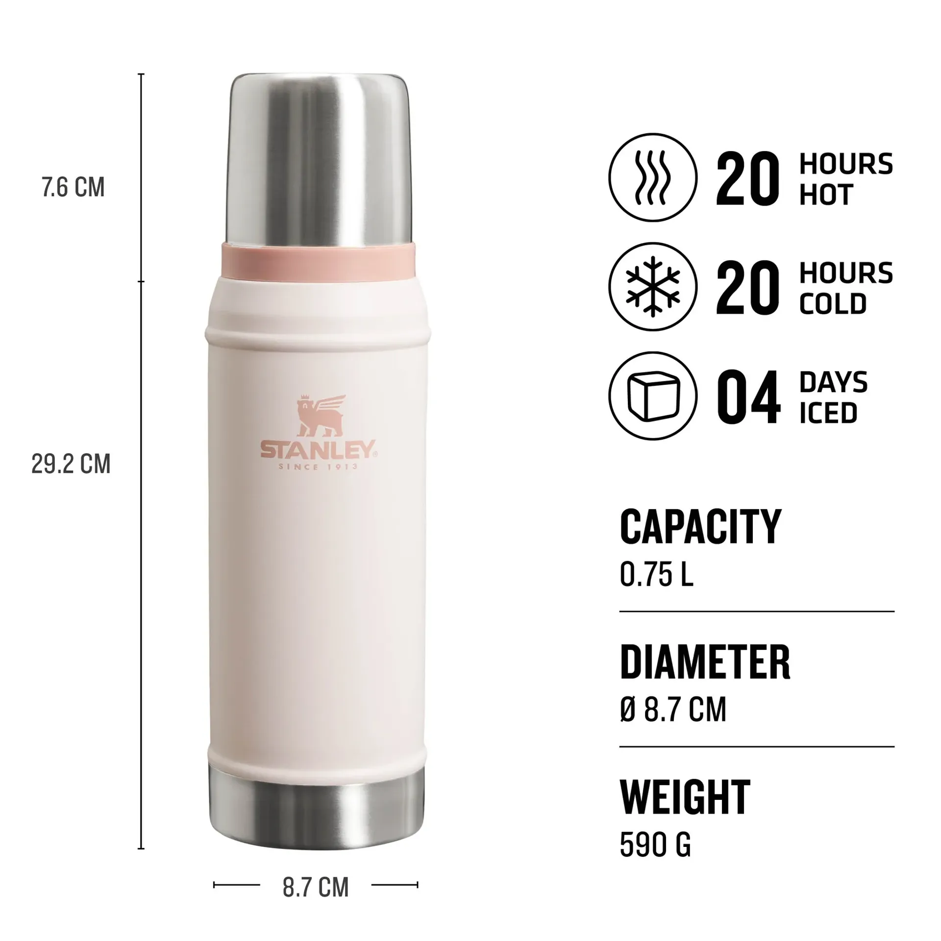 This legendary Stainless Steel vacuum bottle keeps 750ml of your favourite drink hot or cold for 20hrs and with the help of some ice cubes, it can keep things ice-cold for up to 4 days.
