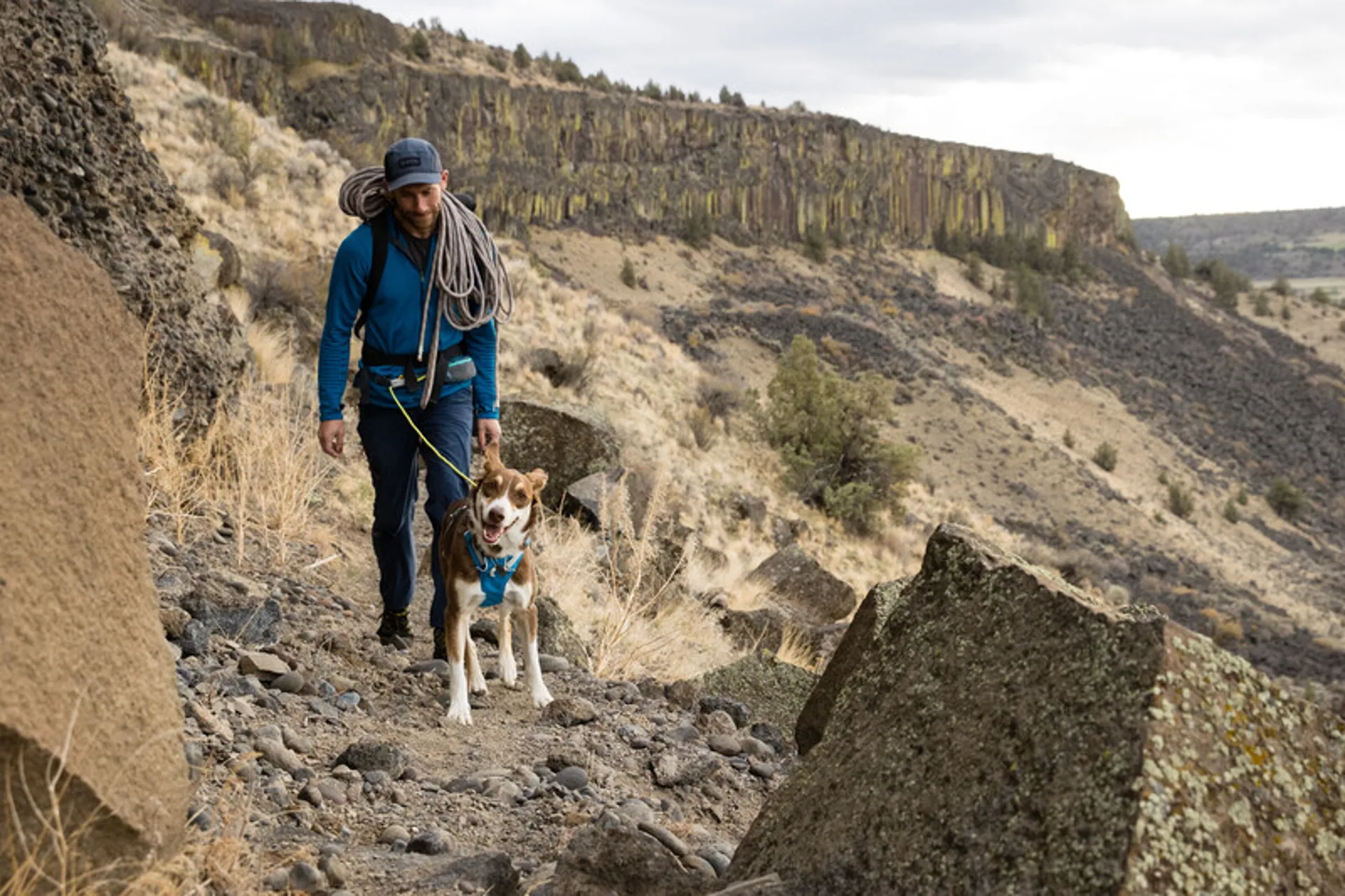 The Hitch Hiker is a climbing-inspired adjustable-length leash and hitching system for ultimate connection versatility with your dog on the fly – from the crag to coffee shops and all the paths in between.