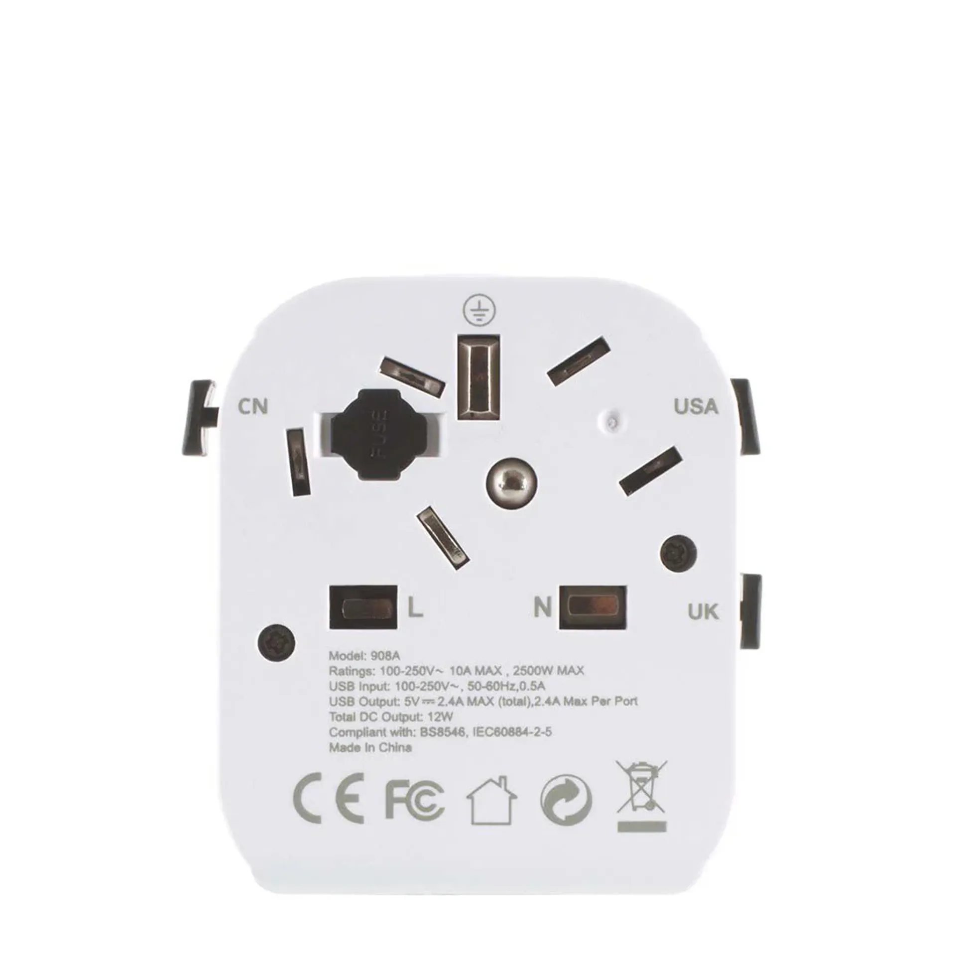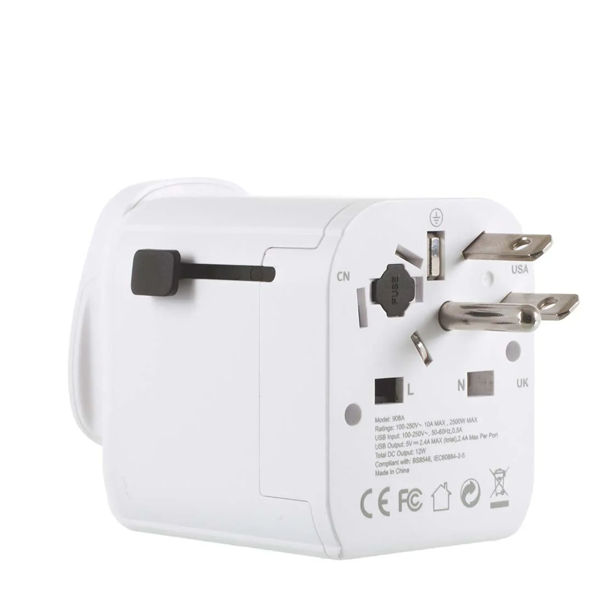 Device input: Australia/China 2-pole, Euro 2-pole, USA/Japan 2-pole Device output: Australia/China, Denmark, Europe, India, Israel, Italy, Switzerland, UK, USA