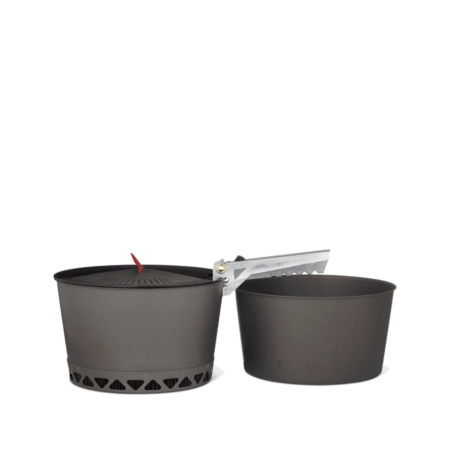 This pot set includes two lightweight, hard-anodised aluminium pots, one with an integrated heat exchanger and ceramic, nonstick coating, a lightweight plastic lid with a silicone handle (works as a strainer) and a removable Crimp Pot Gripper that allows you to handle pots and pans without the need for a heat-protective glove.