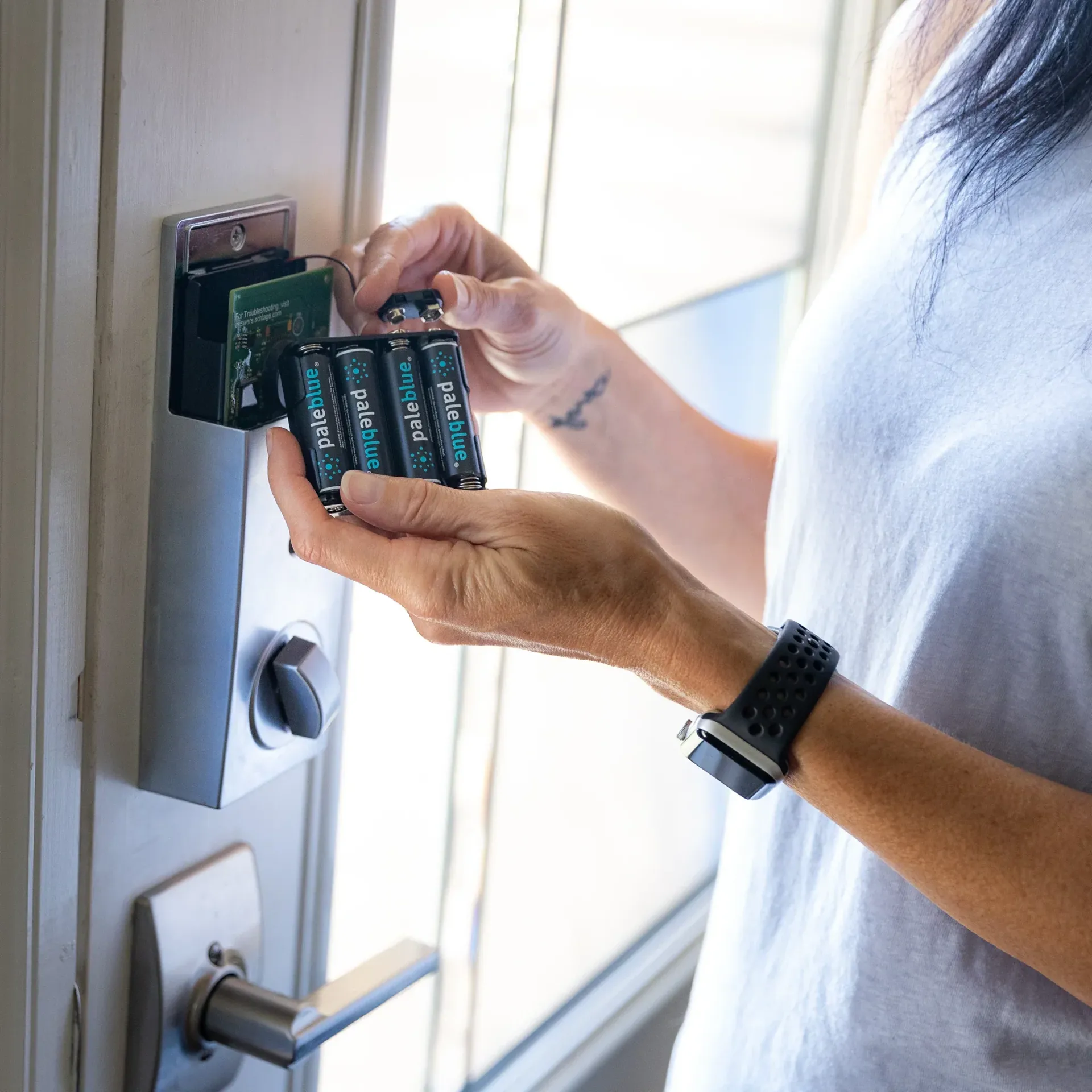 Self-Discharge: The dormant / self discharge characteristics of Pale Blue batteries are very low. This is one of the advantages of a lithium ion battery with a control circuit, vs an alkaline or NiMh battery, where the cell discharges directly into the circuit (no control circuit). The battery life in dormant mode depends partly on the environment. High ambient temperatures, and higher humidity, increases the internal drain. But in normal circumstances a battery installed in a device, like a door lock, will last ~12 months.