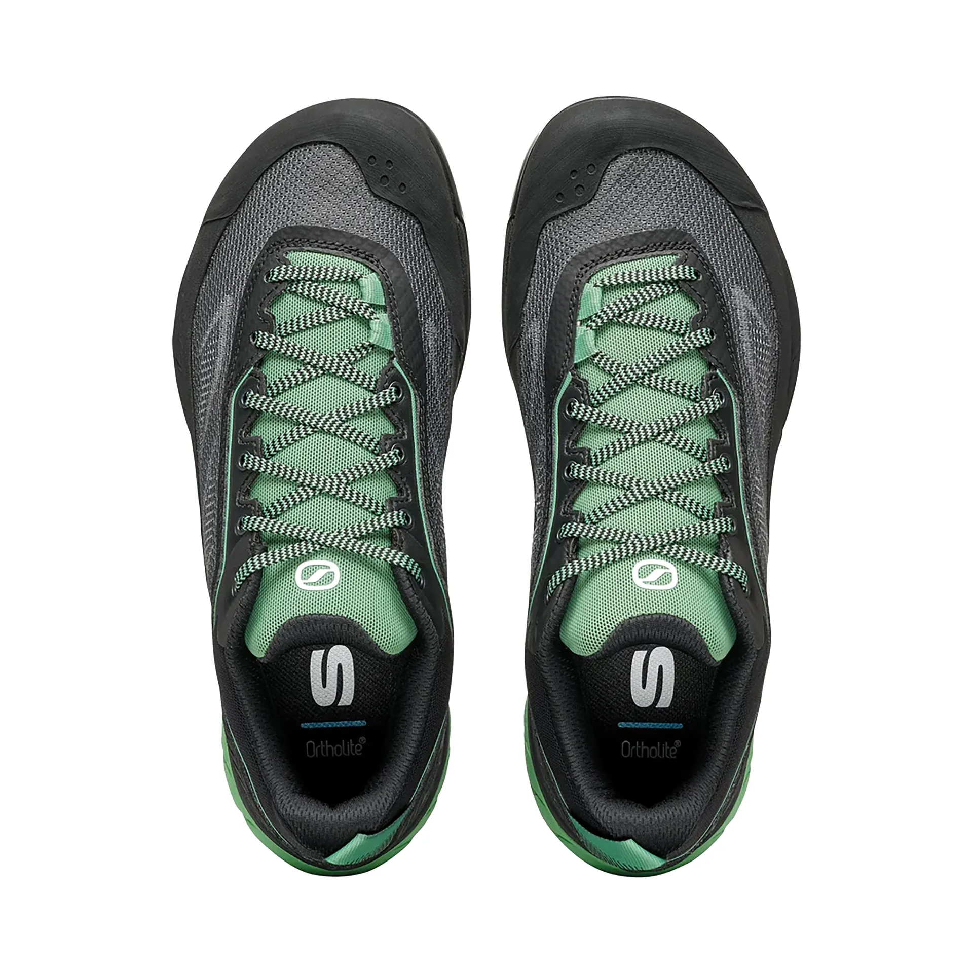Scarpa’s EXO construction features a welded TPU exoskeleton that integrates with the upper and lacing to secure the midfoot, distribute lace pressure evenly, and enhance torsional control. It stabilises the shoe on traverses and small edges while protecting the mesh from abrasion — without adding bulk.