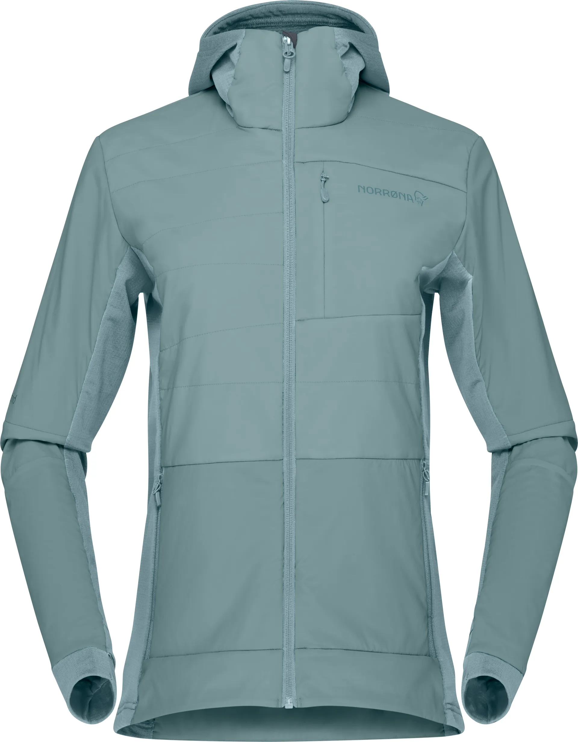 Norrona refers to its synthetic insulation as "Thermo." This type of insulation is used as an alternative to down because it retains its insulating properties even when wet.It'sbeneficial during activities that cause sweating, exposure to rain, or in consistently humid conditions. Synthetic insulation like Primaloft or Pinneco, used in this jacket, provides excellent warmth while being lightweight and easy to maintain.