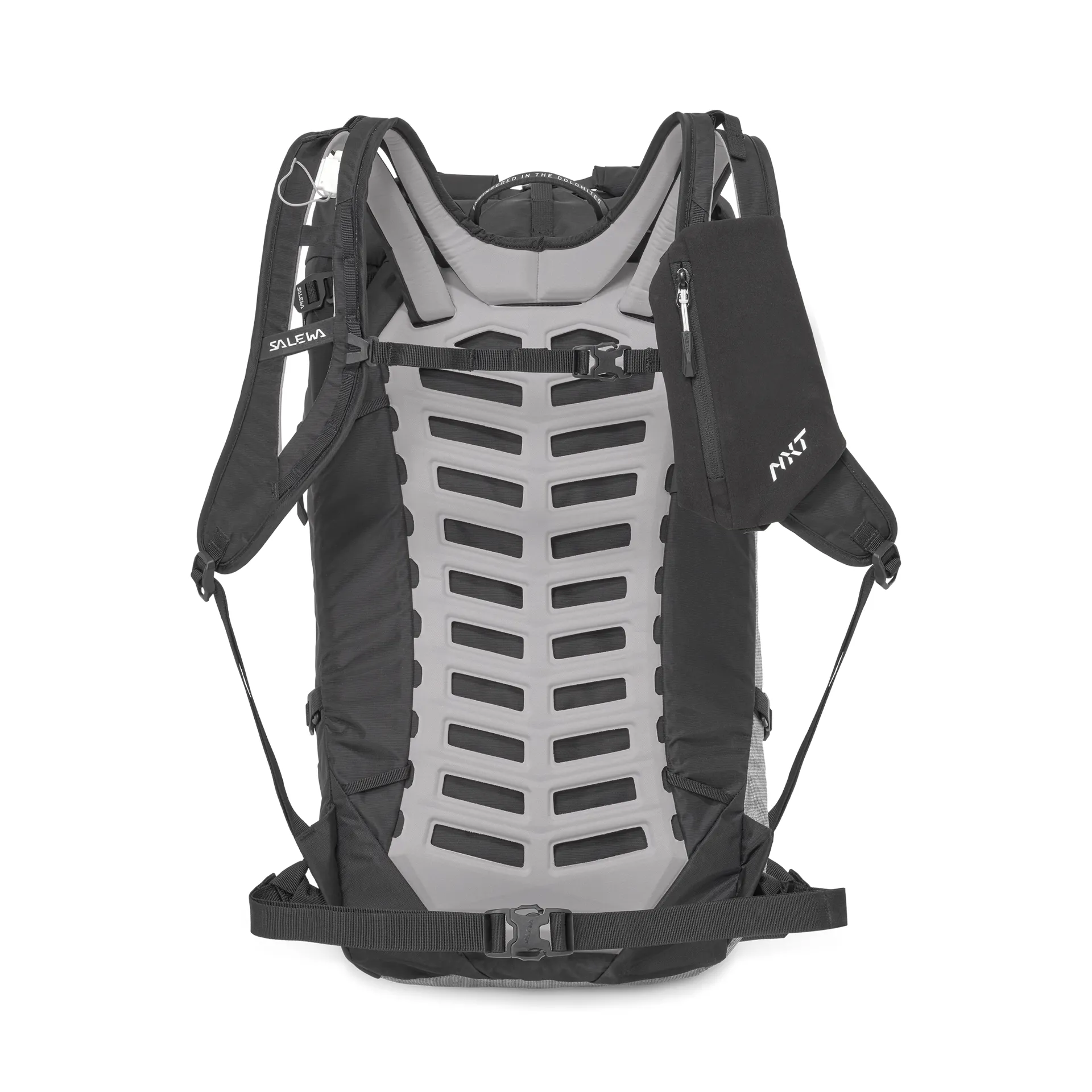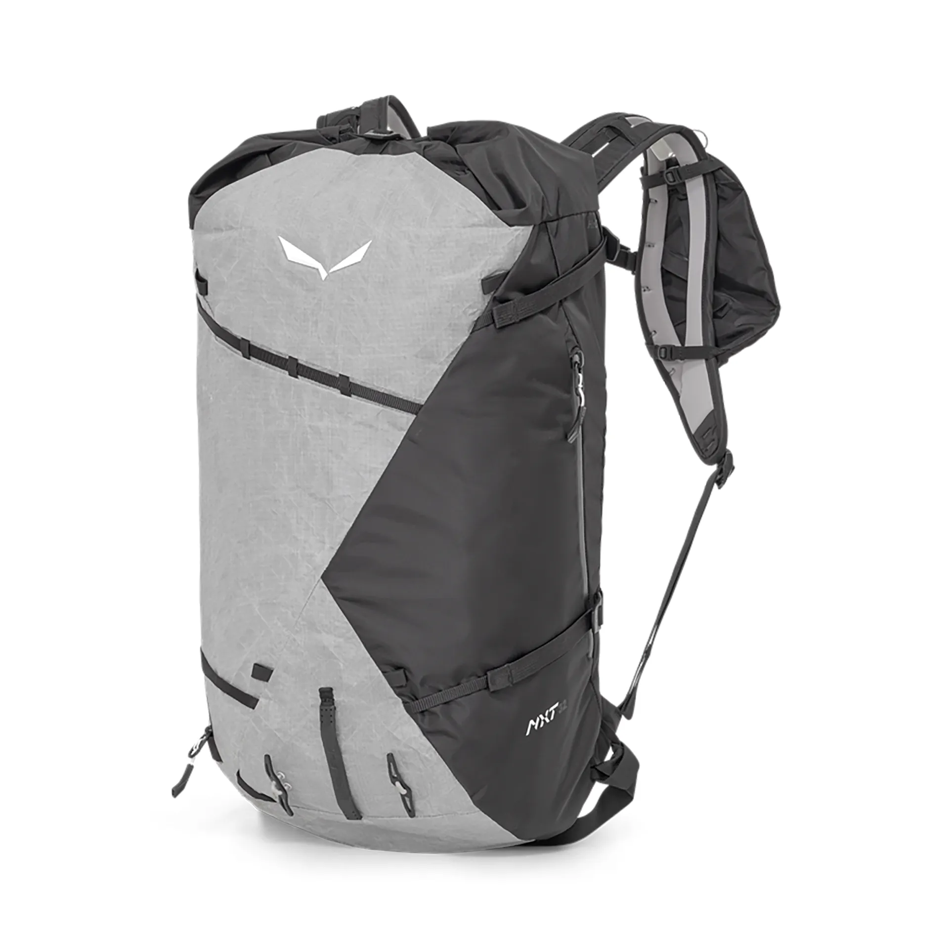For enhanced comfort and load stability, the NXT 32L features a split shoulder strap construction and load control straps that distribute weight evenly, reducing shoulder strain and ensuring a balanced feel on rough terrain. The removable hip strap provides added support and can be detached for lighter trips when you want to reduce bulk. The pack is also compatible with Salewa's Helmet Holder net and ORTLES Diagonal Ski-Fix Straps, allowing you to tailor the setup for skiing and mountaineering needs.