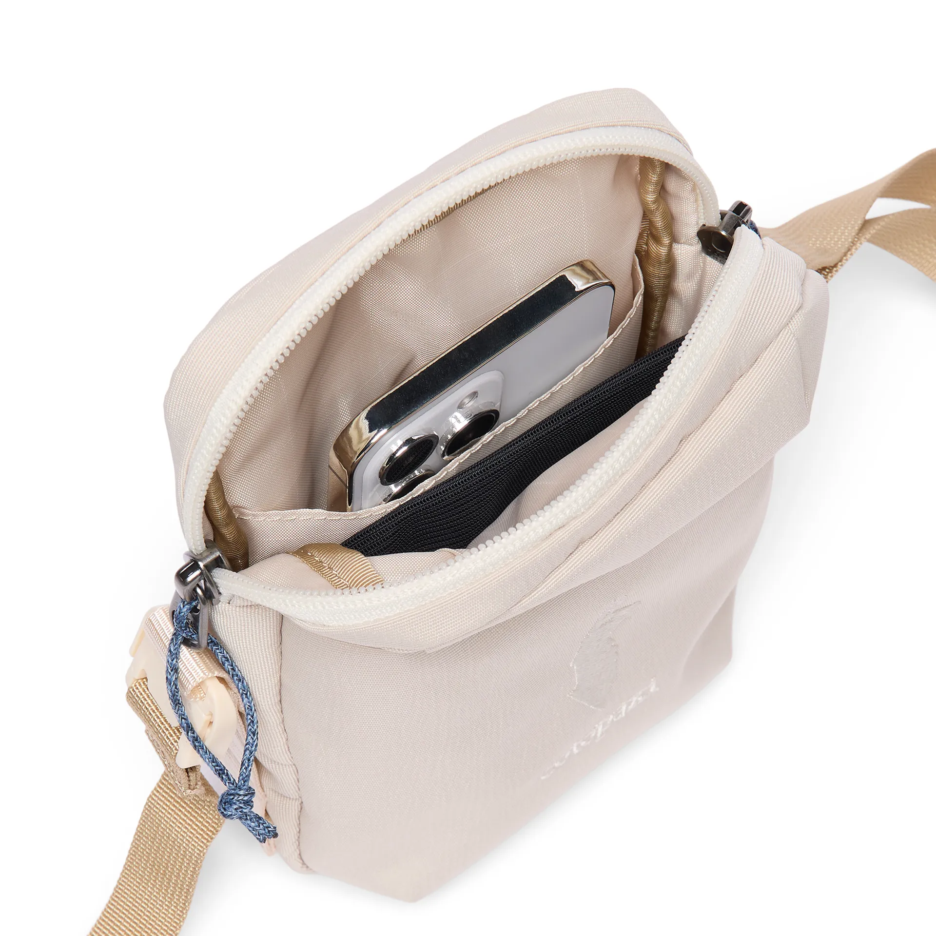 This shoulder bag has one main zippered compartment and a slim front slip pocket. That main space may only be 1 litre, but it's surprisingly practical—roomy enough for a small wallet, phone, earbuds, lip balm, and maybe even a snack bar if you're strategic. It zips closed with two easy-grab cords so that you can open it quickly on the go. The front pocket is perfect for slim, flat items like a travel pass, receipts, or a folded map—anything you want to keep handy without digging.