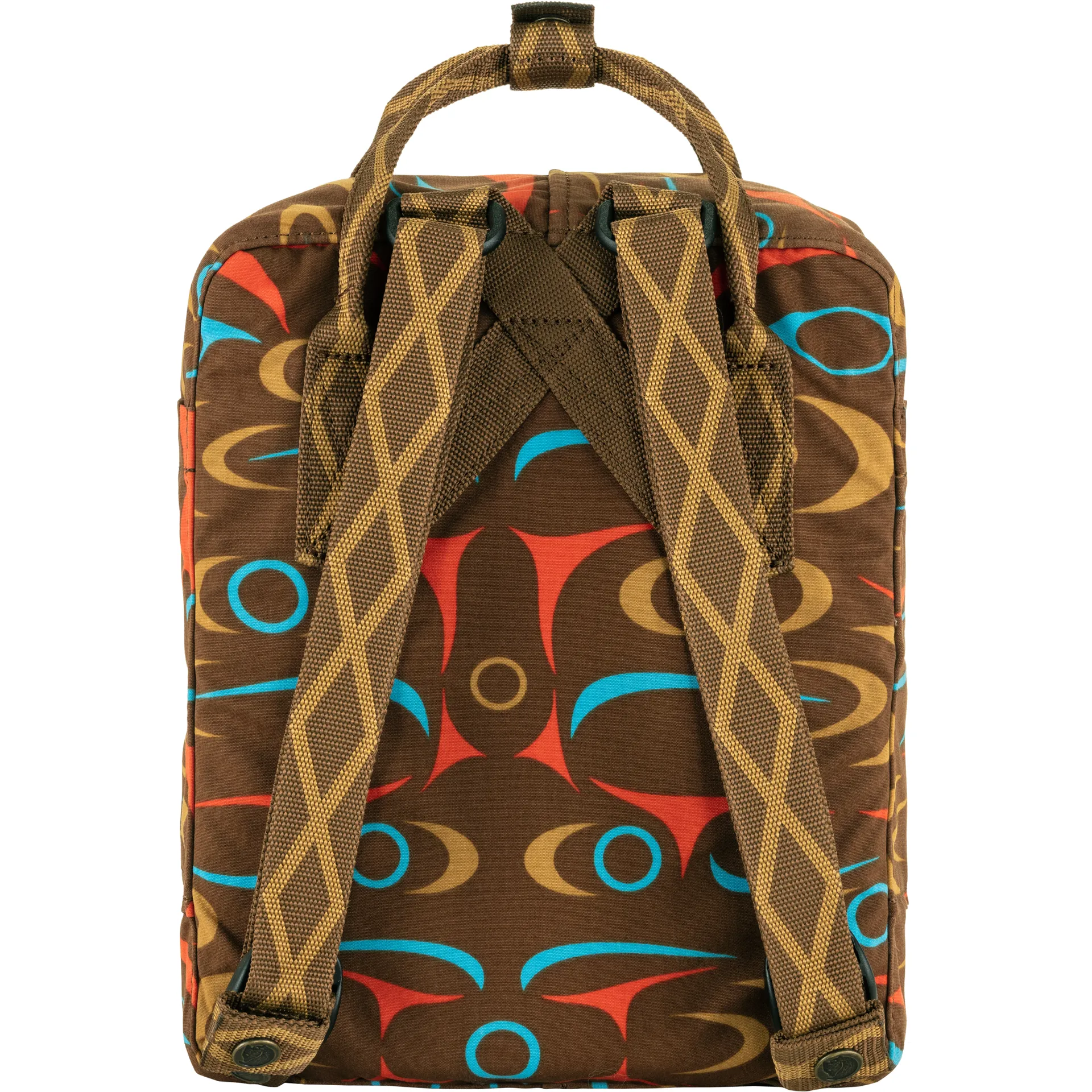 The Kanken Art Mini proudly boasts the ancestral artwork of Charlene Johnny, a Coast Salish artist from the Quw'utsun tribes of Duncan, BC. Due to the patterned nature of the fabric, each backpack will slightly vary in appearance, adding to the already special and unique design of the bag.