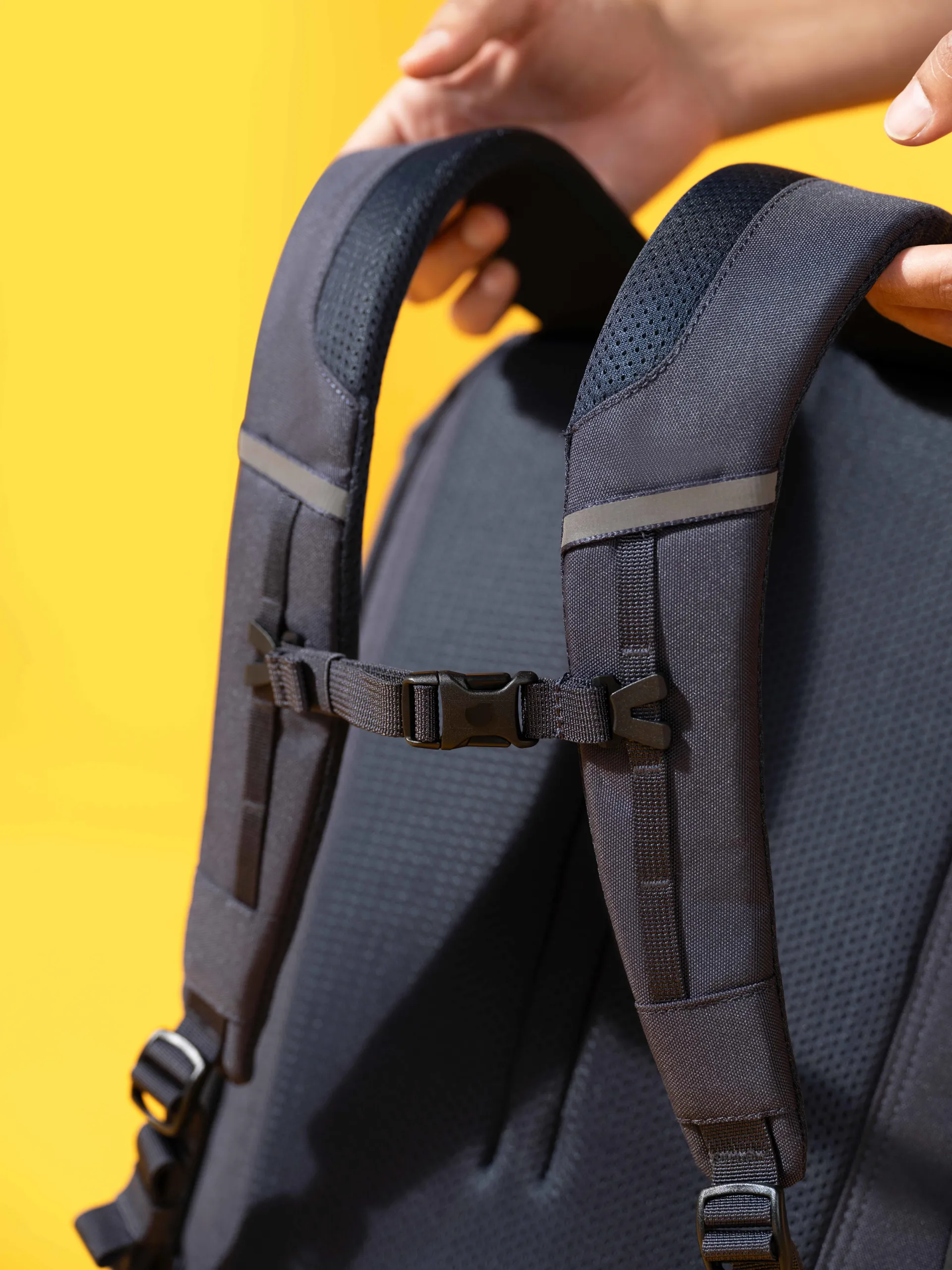 The padded, airmesh back panel enhances ventilation on the back. It improves comfort by preventing items inside from digging in and making the back of the pack generally softer. The shoulder straps are also lightly padded, so they feel comfy to wear for longer periods or when the load is heavier.