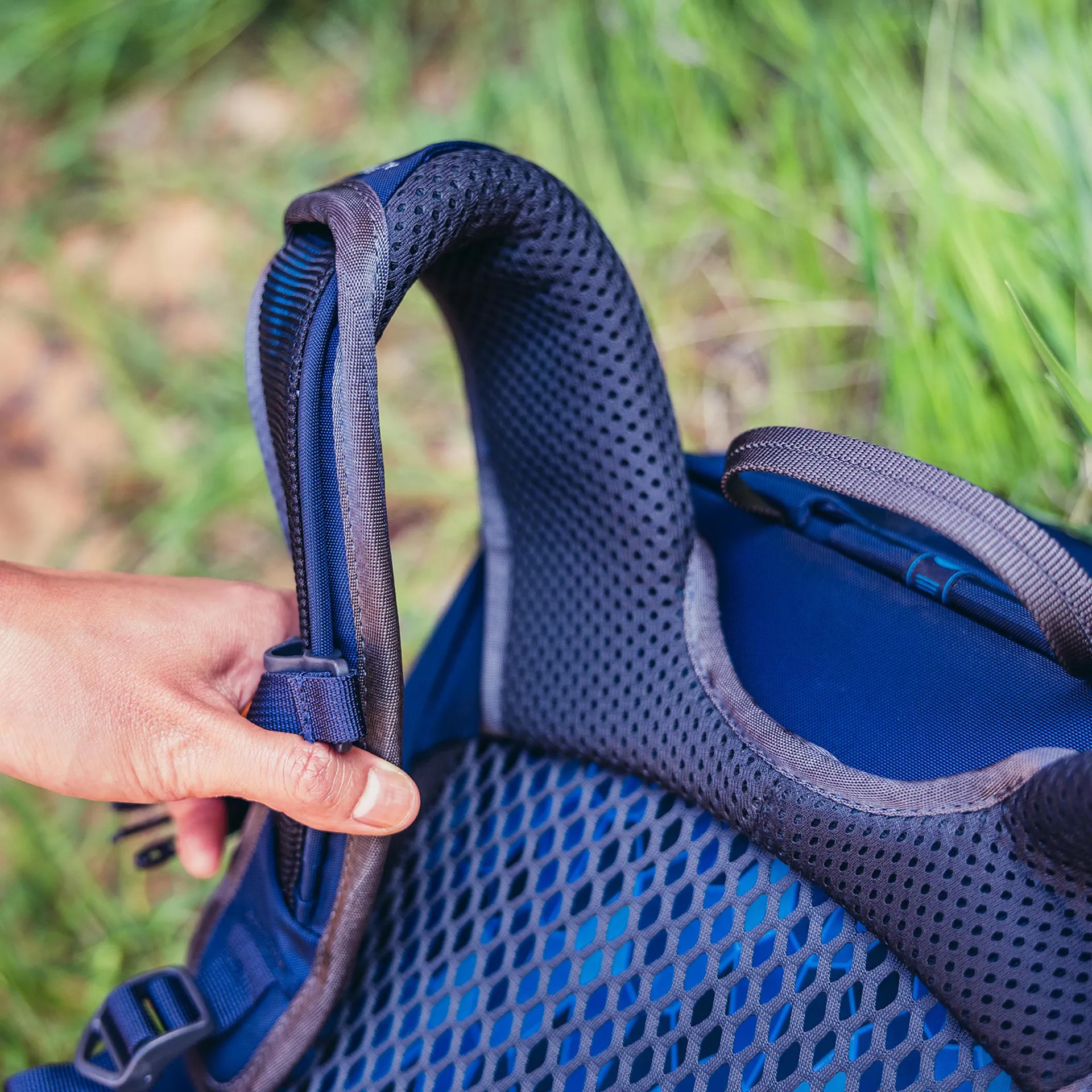 The one-piece hip belt offers seamless and even support, while strategically placed linear mesh on the back panel and harness helps distribute the load for a stable and comfortable on-trail experience.