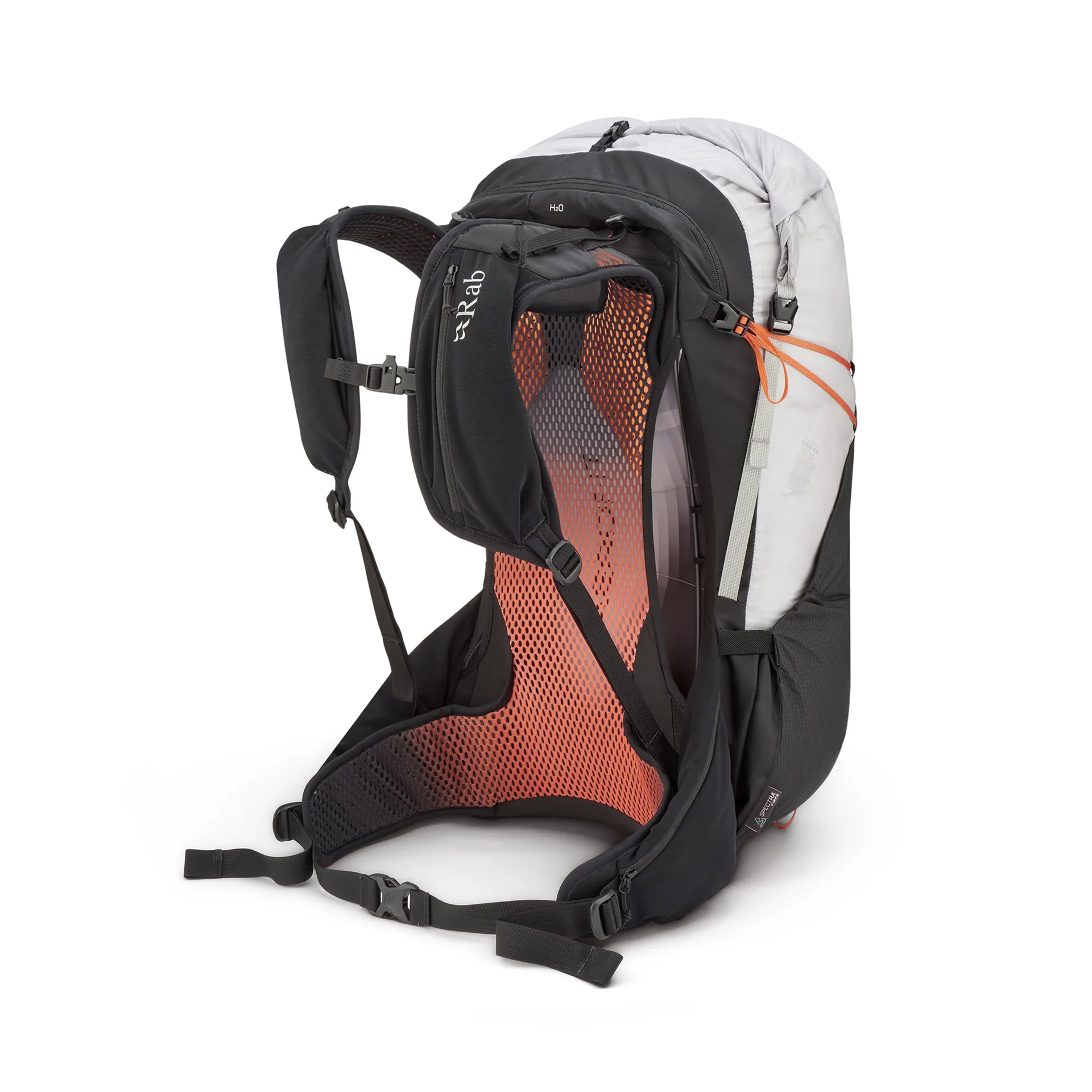 Outer: The main body of the pack is made from 40D high tenacity recycled nylon, with 100D Spectra® Ripstop reinforcements across the front and sides of the pack.