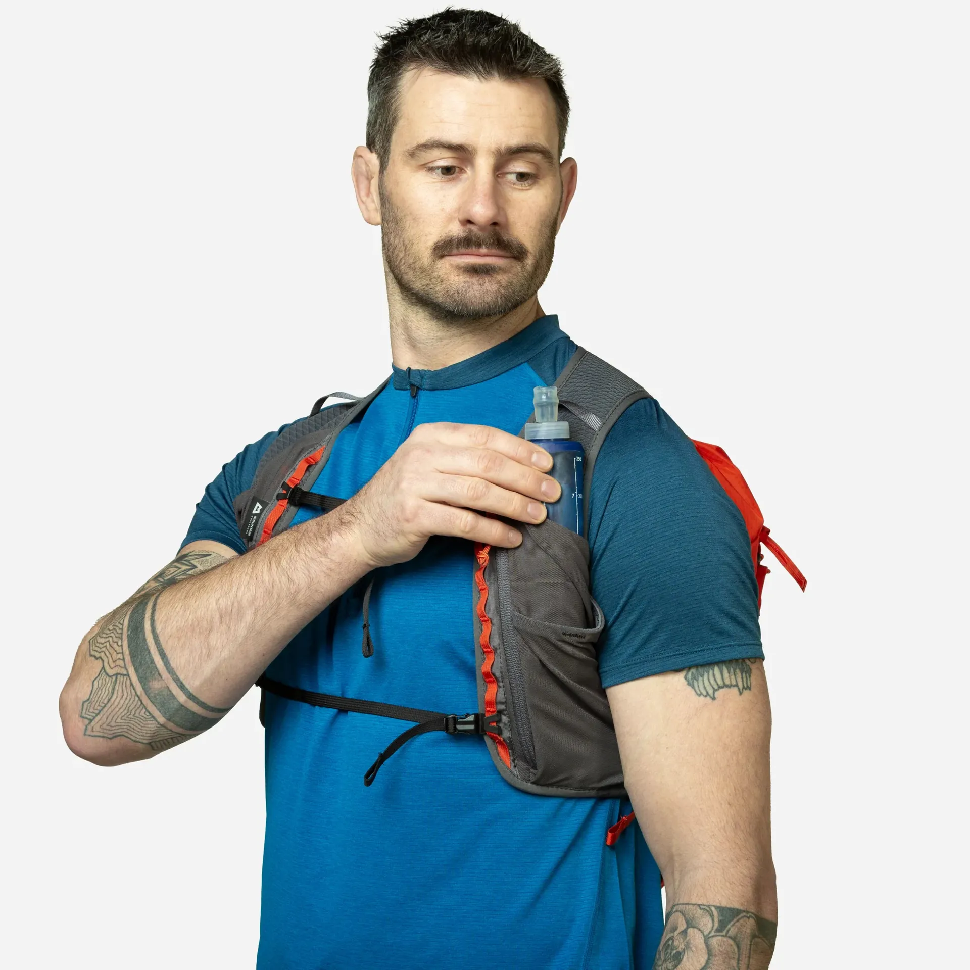 Like a standard running vest, it has a full harness that sits across the front and back, with a zipped phone pocket and mesh pockets for smaller essentials. A zipped internal pocket and large front stash pocket allow you to organise particular belongings. Plus, the side zip gives you quick access to the main compartment without having to faff around and remove the pack altogether.