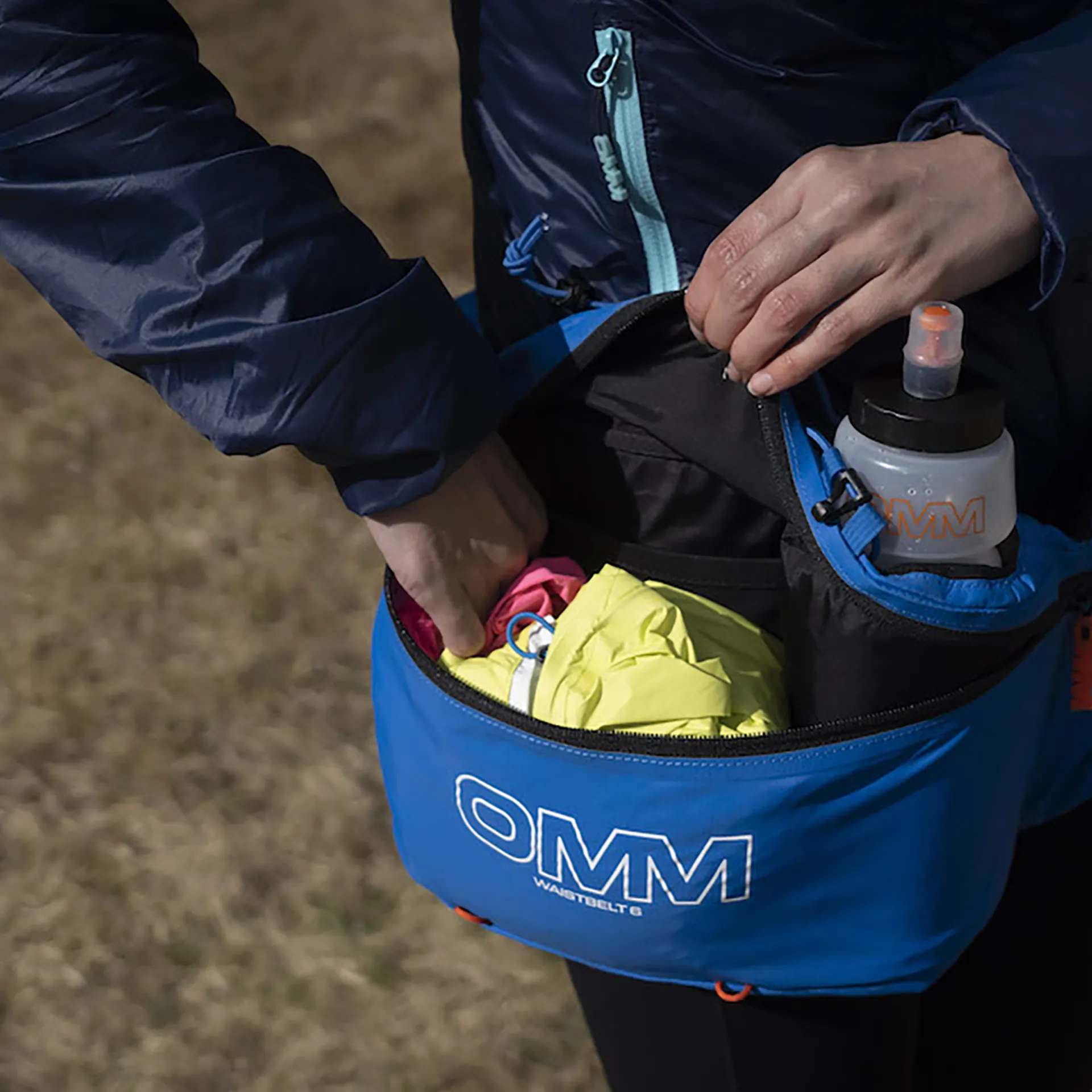 A central quick stash bottle holster, supplied with the OMM Ultra Bottle, allows easy one-handed access on the move. This setup keeps your hydration securely positioned in the centre of gravity, minimising bounce and improving efficiency on uneven terrain.
