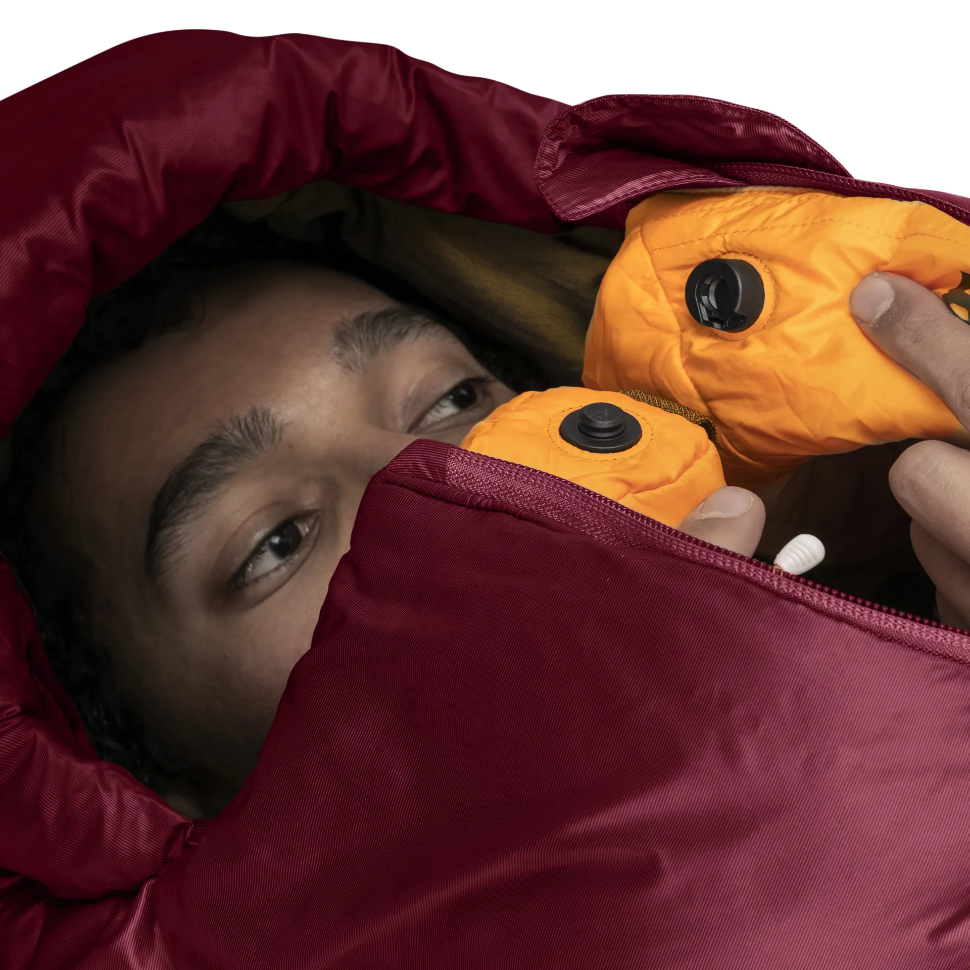 Another unique feature is the inclusion of a sleep mask and earplugs — this relates to the 'perform' part in the title; the bag is designed to give you the best nights sleep possible so you can perform the following day. A specific fabric is used in the hood which is quieter than your average fabric, further reducing noise if you're not using the earplugs. Even if you're not using the mask or plugs, they can be neatly stashed away in the internal pocket, keeping them within arms reach. This is also a great place to pop your phone to prevent it losing battery in cold conditions.