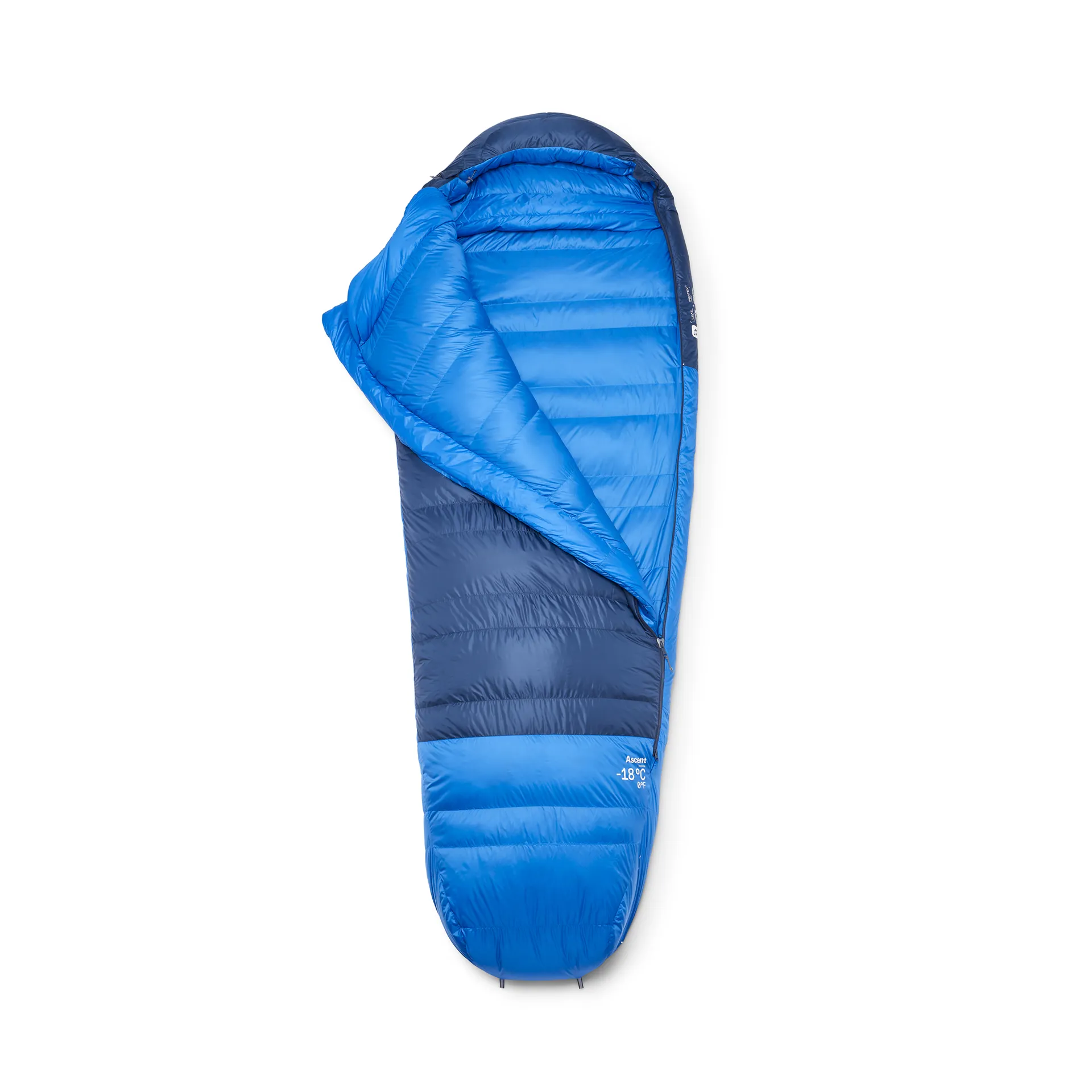 The sleeping bag is fastened with a two-way 3/4 YKK® anti-snag main zip with a down-filled baffle running alongside to prevent cold from entering the bag via the zip. A 1/2-length zip on the other side of the bag provides flexible entry and ventilation options. Anti-snag zip inserts and an anti-snag internal zip guard help to prevent the fabric from getting caught and snagging or tearing on the zips.