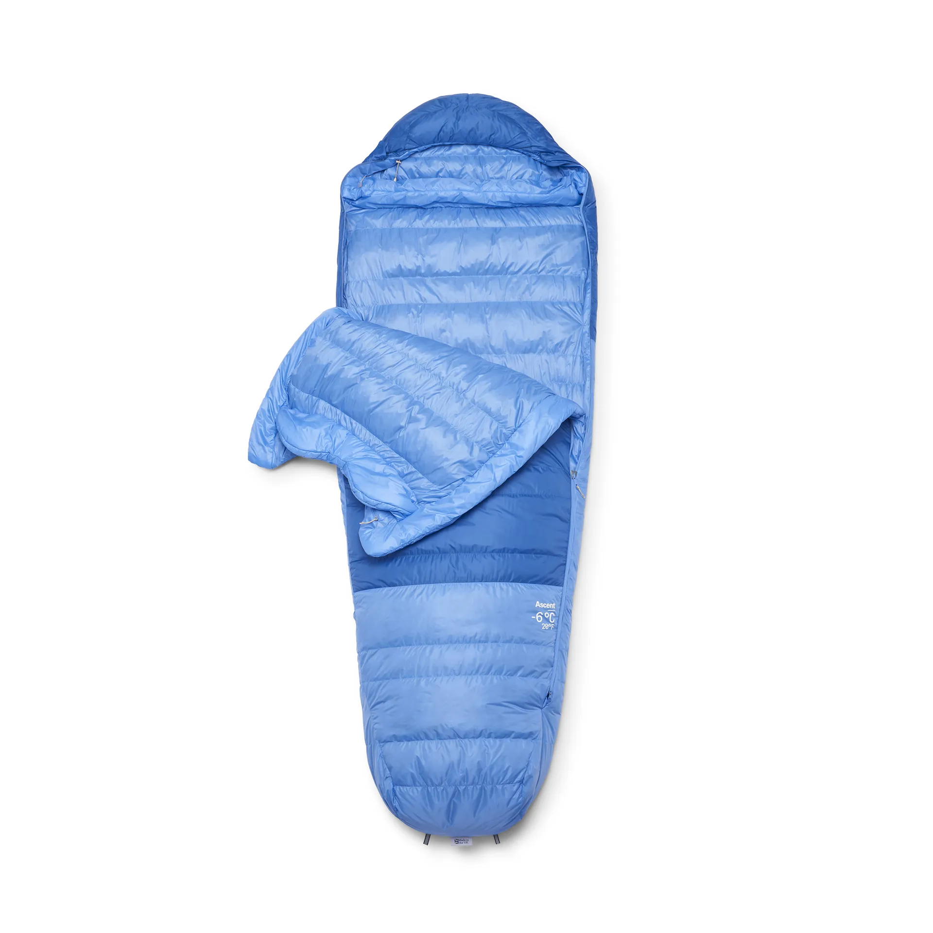 The sleeping bag is fastened with a two-way 3/4 YKK® anti-snag main zip with a down-filled baffle running alongside to prevent cold from entering the bag via the zip. A 1/2-length zip on the other side of the bag provides flexible entry and ventilation options. Anti-snag zip inserts and an anti-snag internal zip guard help to prevent the fabric from getting caught and snagging or tearing on the zips.