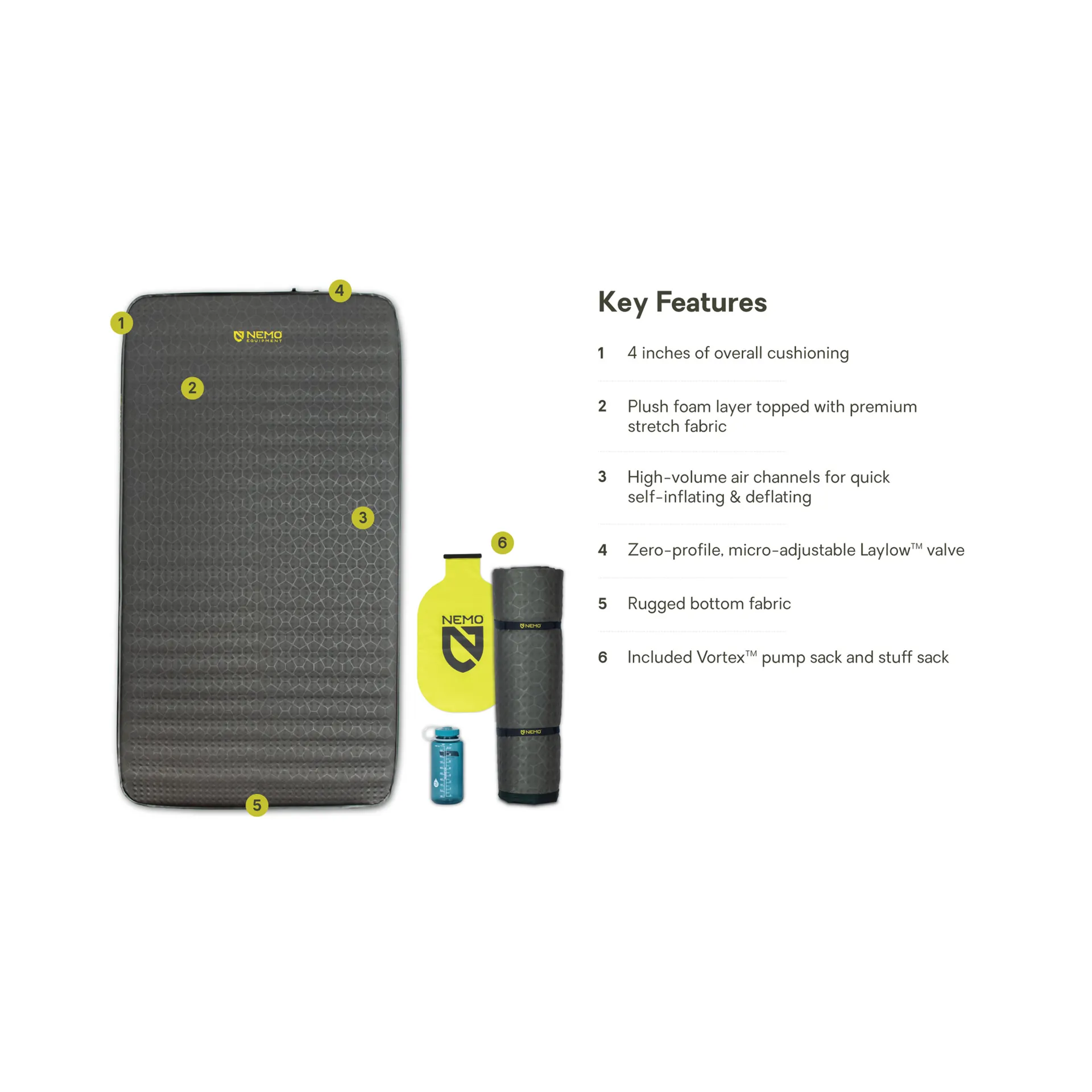 The included Vortex stuff sack doubles as a high-volume pump sack, speeding inflation while preventing moisture from entering the foam. It can also serve as a dry bag for extra gear.
